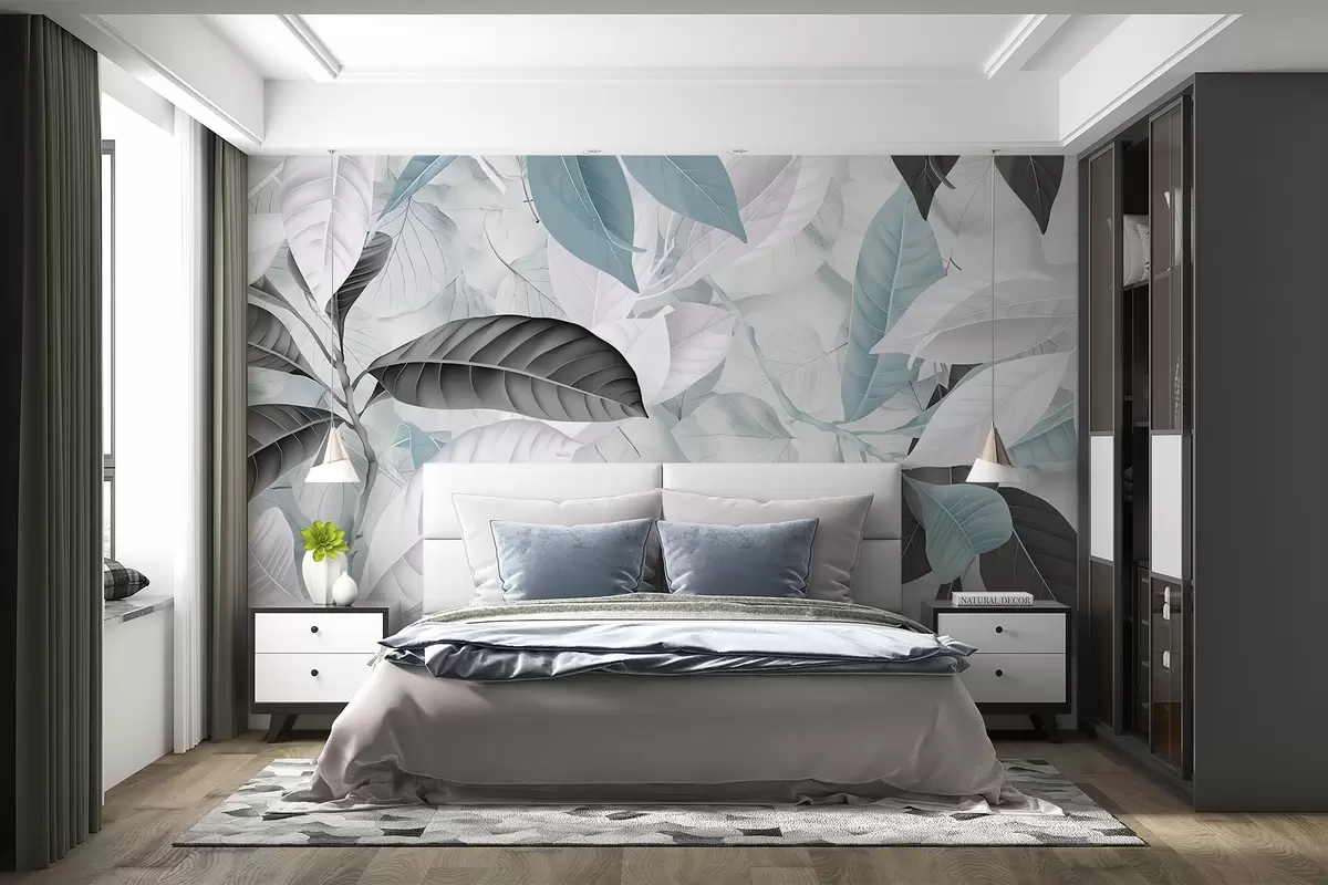 Fototapeten Großer Druck von blauen und grauen Blättern vor einem hellen, strukturierten Hintergrund, der ein üppiges tropisches Gefühl vermittelt N° w08468v1