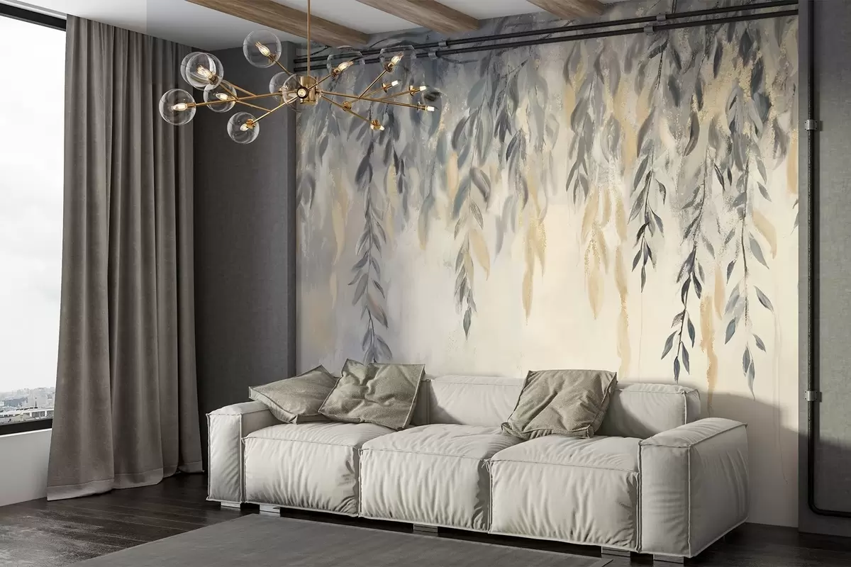 Fototapeten Weidenzweige mit herabhängenden Blättern vor einem weichen, verschwommenen, strukturierten Hintergrund N° w08473