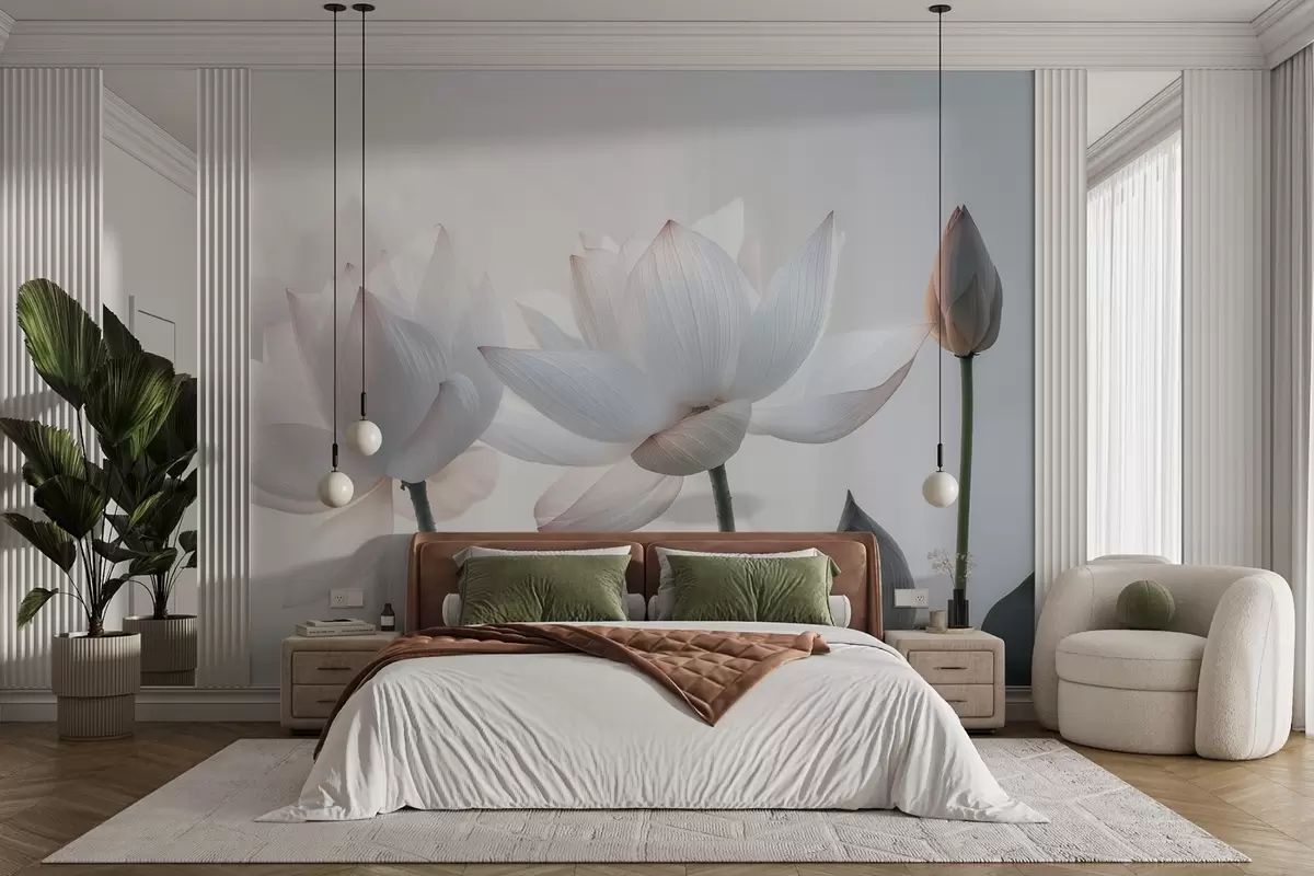 Fototapeten Zarte Lotusblumen mit Blütenblättern und Blättern N° w08488