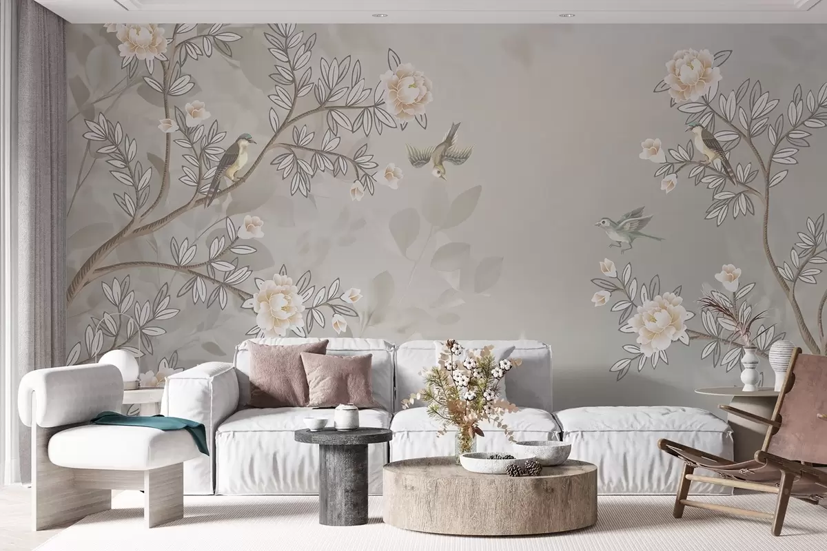 Fototapeten Zweige mit Rosen und fliegenden Vögeln in hellen Tönen N° w08493