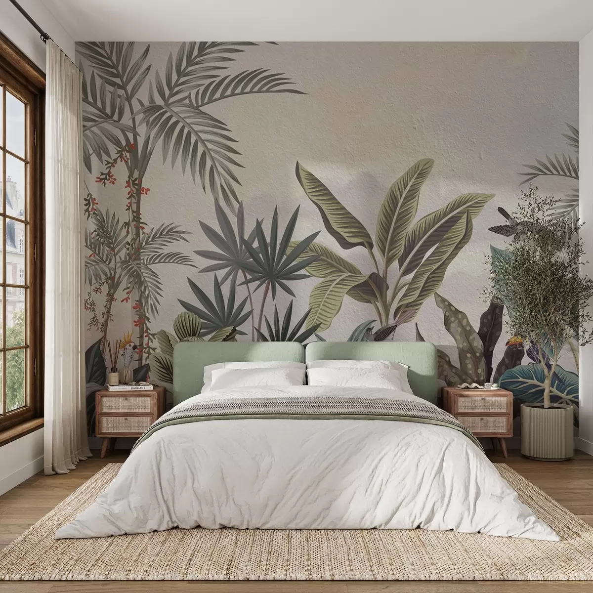 Fototapeten Tropischer Dschungel mit Palmen und bunten Vögeln N° w08496
