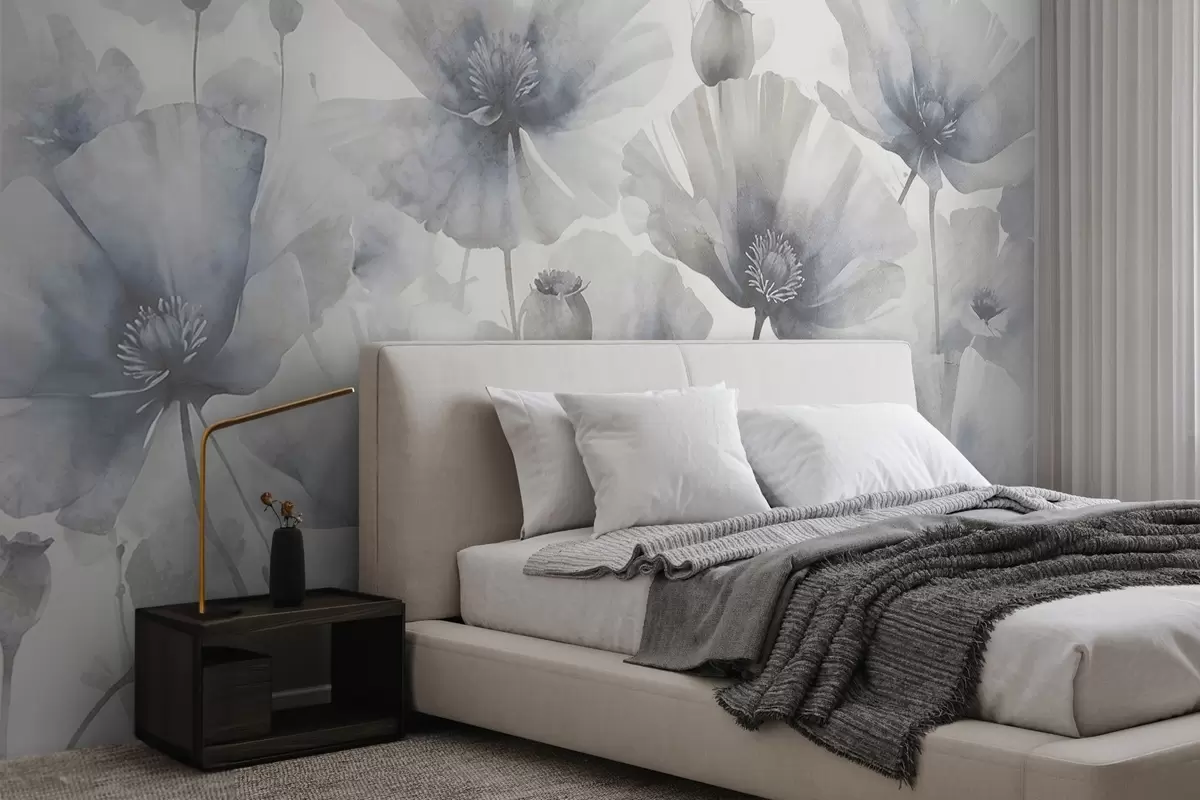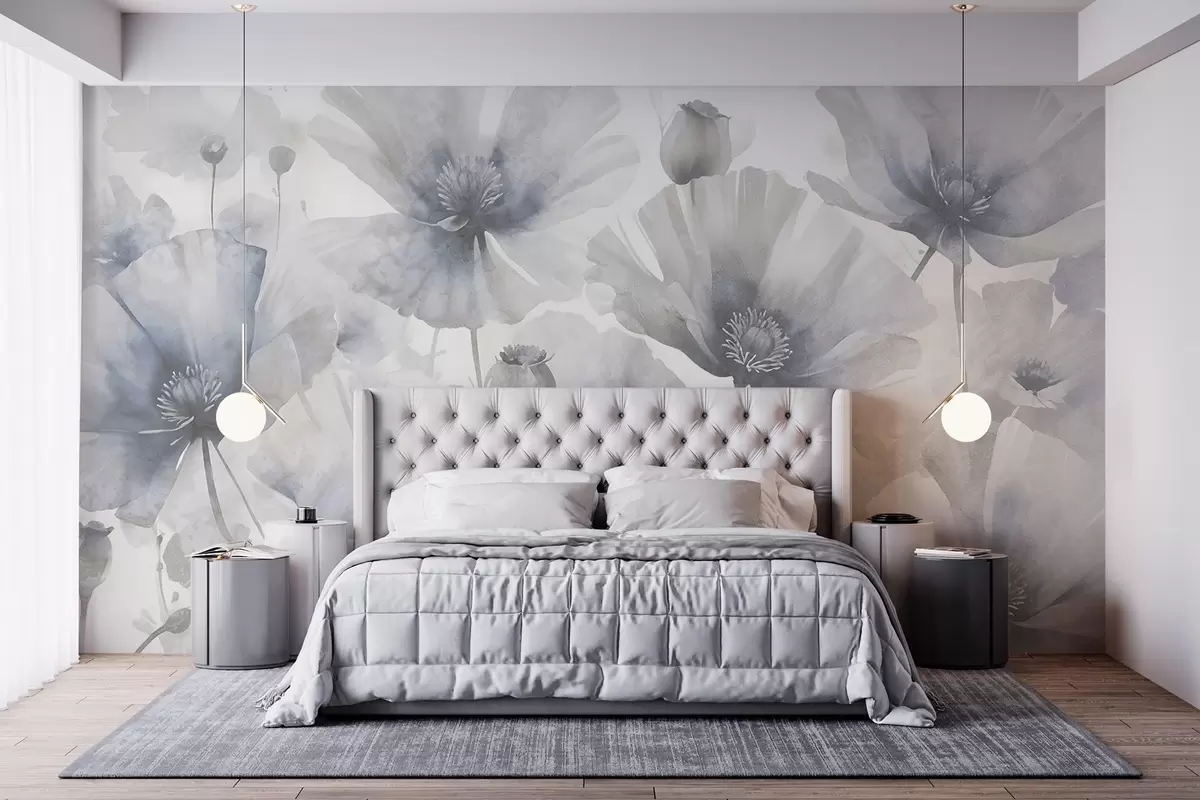 Fototapeten Zarte, graue und weiße Grunge-Blumen mit weichen, verschwommenen Blütenblättern vor einem weißen Hintergrund N° w08526