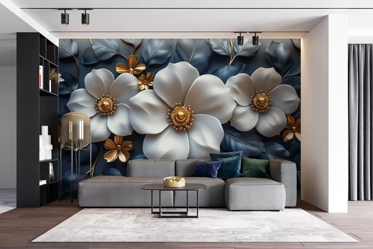 Fototapeten Große weiße Blumen auf einem eleganten blauen Hintergrund mit Blättern N° w08559