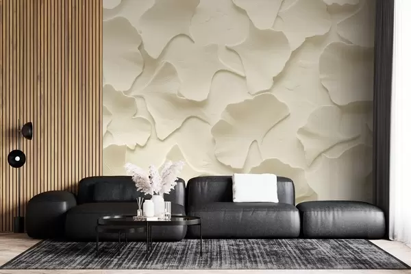 Fototapeten Stuck mit zarter Prägung von Ginkgoblättern auf zartbeigem Hintergrund N° w08560