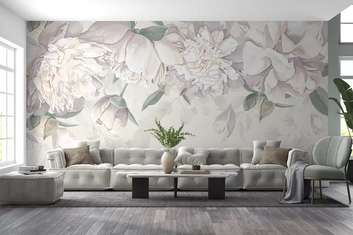 Fototapeten Zarte pastellfarbene Pfingstrosen in Weiß und Rosa mit grünen Blättern, arrangiert in einem weichen, romantischen Blumenhintergrund N° w08577