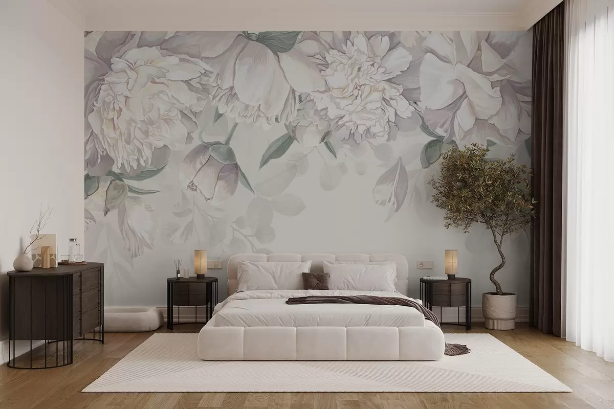 Fototapeten Zarte pastellfarbene Pfingstrosen in Weiß und Rosa mit grünen Blättern, arrangiert in einem weichen, romantischen Blumenhintergrund N° w08577