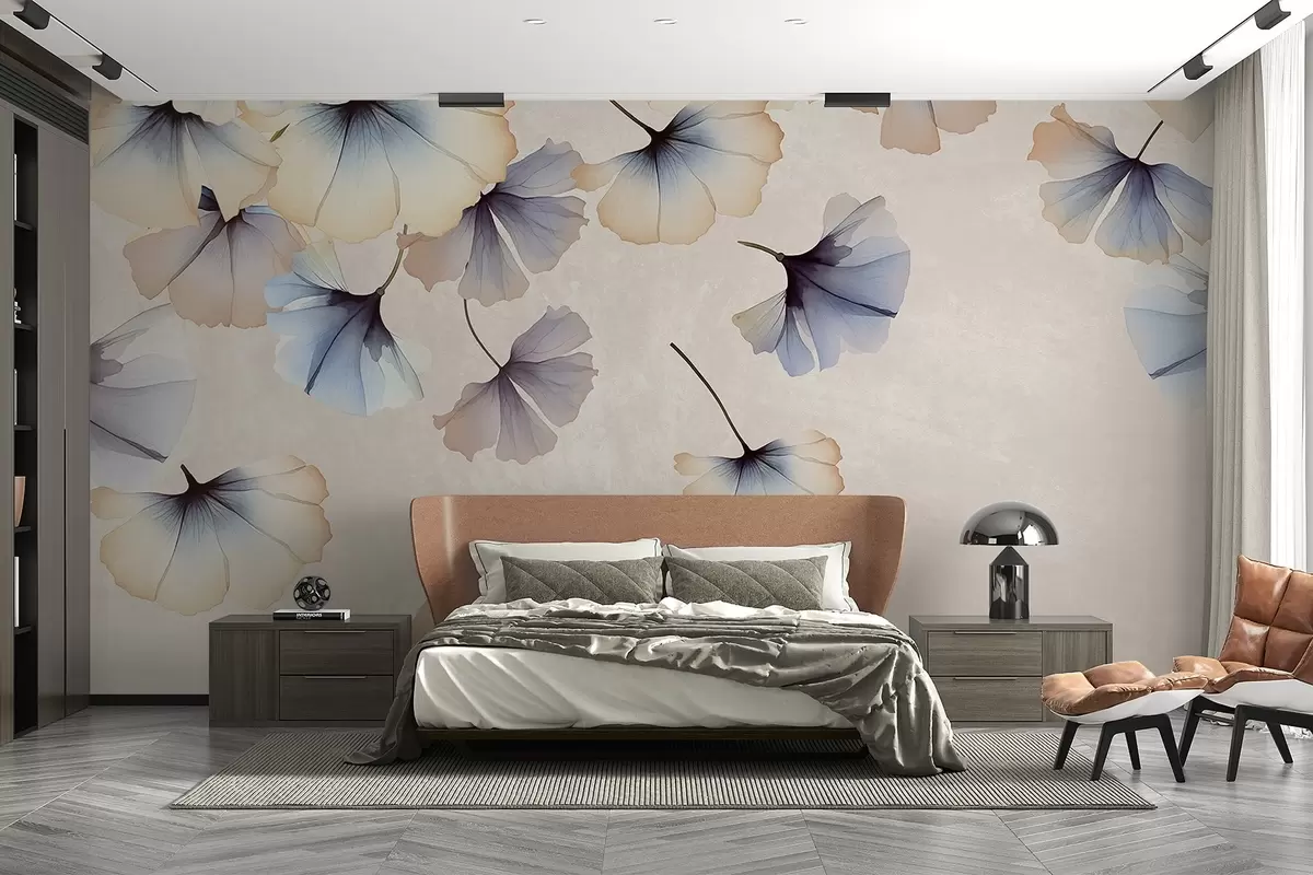 Fototapeten Pastellfarbene blaue und beige Ginkgoblätter mit zarten, in der Luft schwebenden Blütenblättern vor einem strukturierten Hintergrund N° w08578