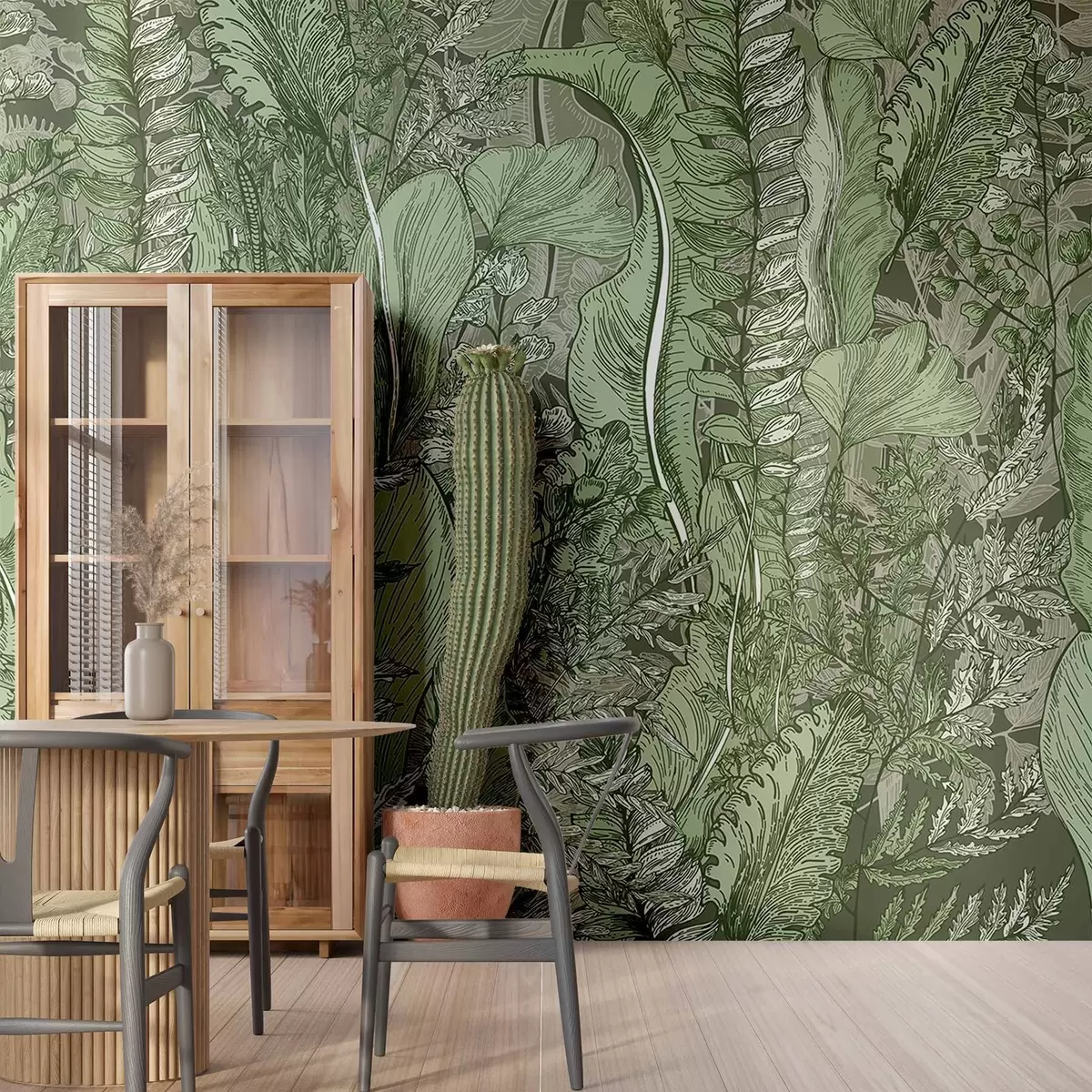 Fototapeten Ein üppiger, grüner Wald mit verschiedenen Arten von Farnen, Blättern und Laub in verschiedenen Grüntönen N° w08579