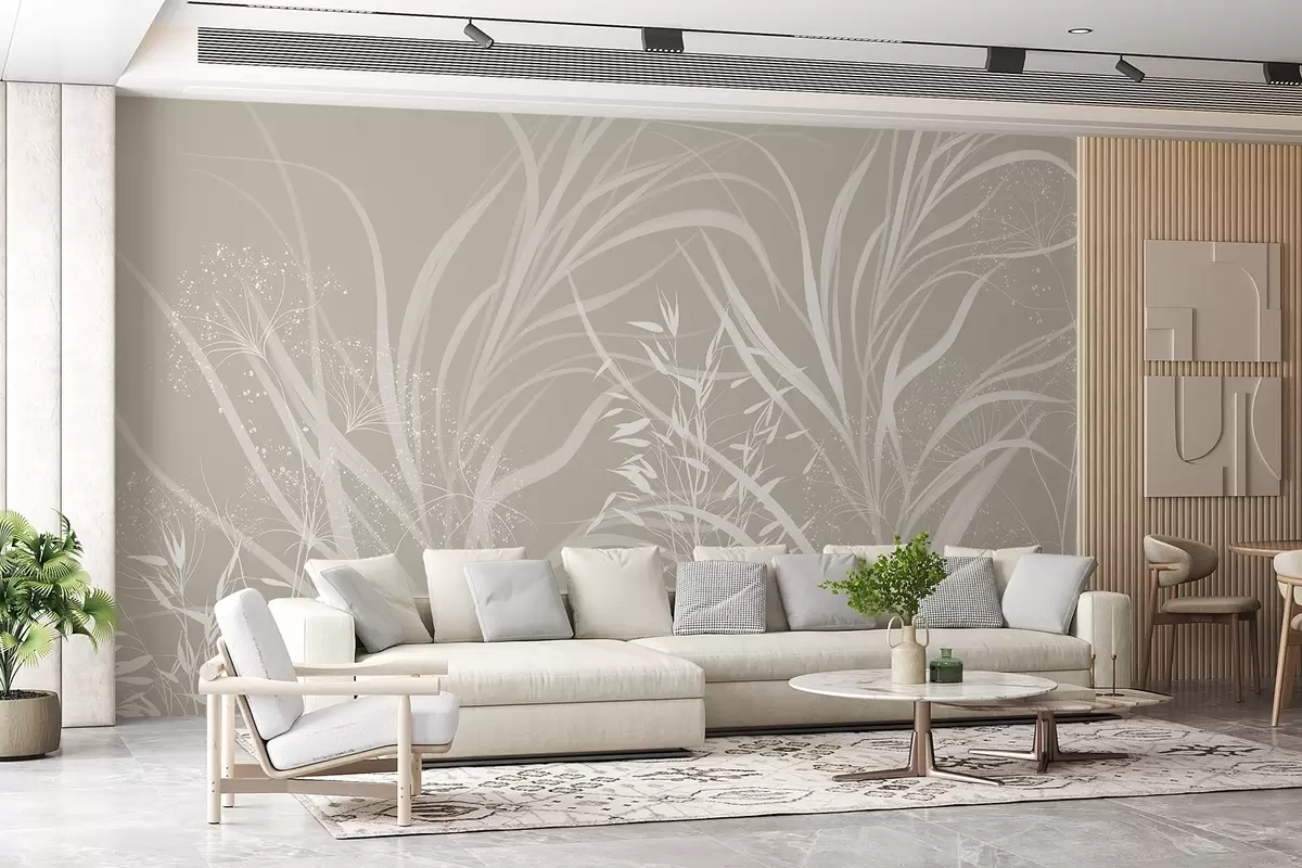 Fototapeten Zarter, moderner, minimalistischer, weißer Blumendruck auf einem hellen, pastell-beigen Hintergrund N° w08583
