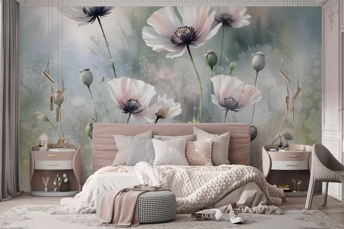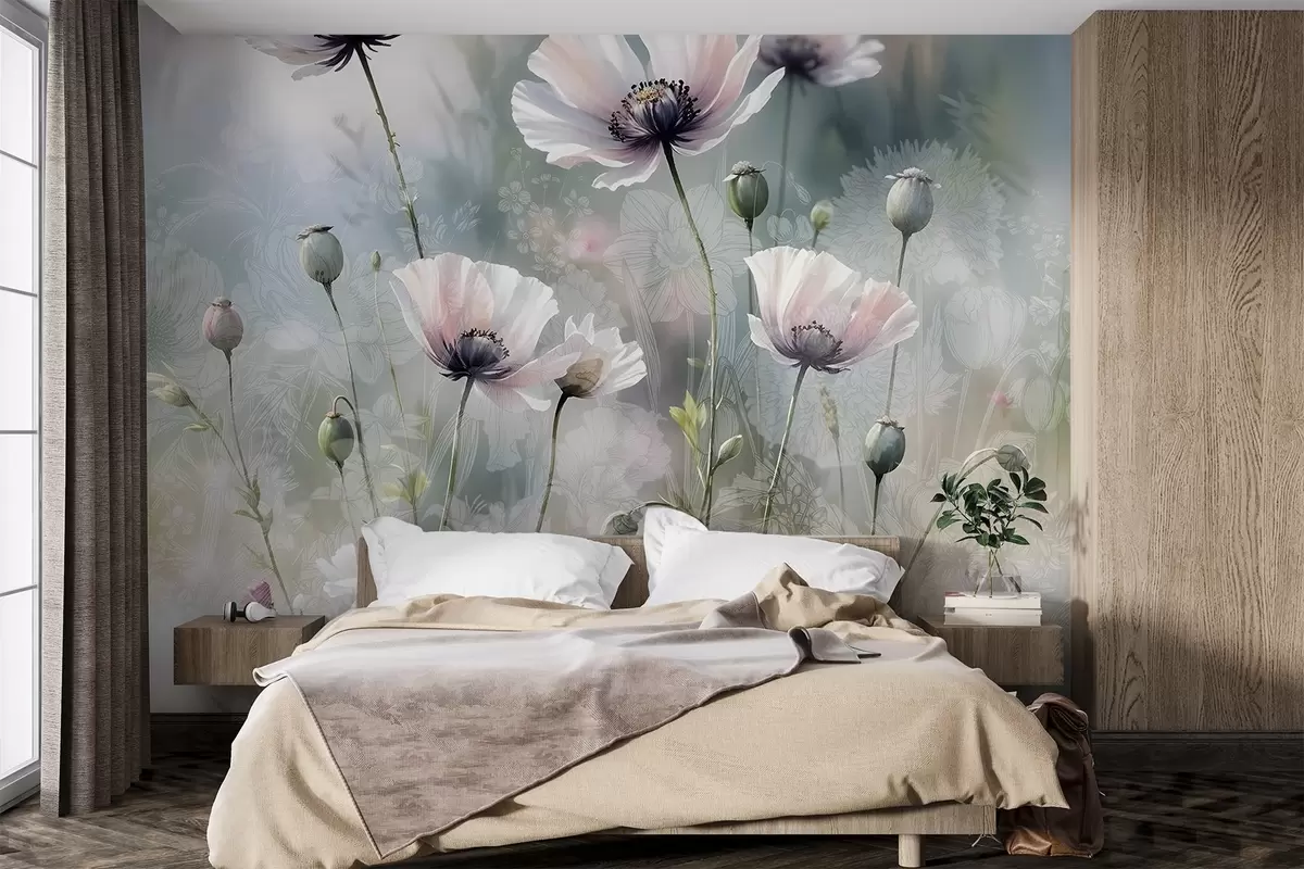 Fototapeten Zarte rosa und lila Mohnblumen mit grünen Stängeln und Knospen vor einem weichen, verschwommenen, strukturierten Hintergrund N° w08585