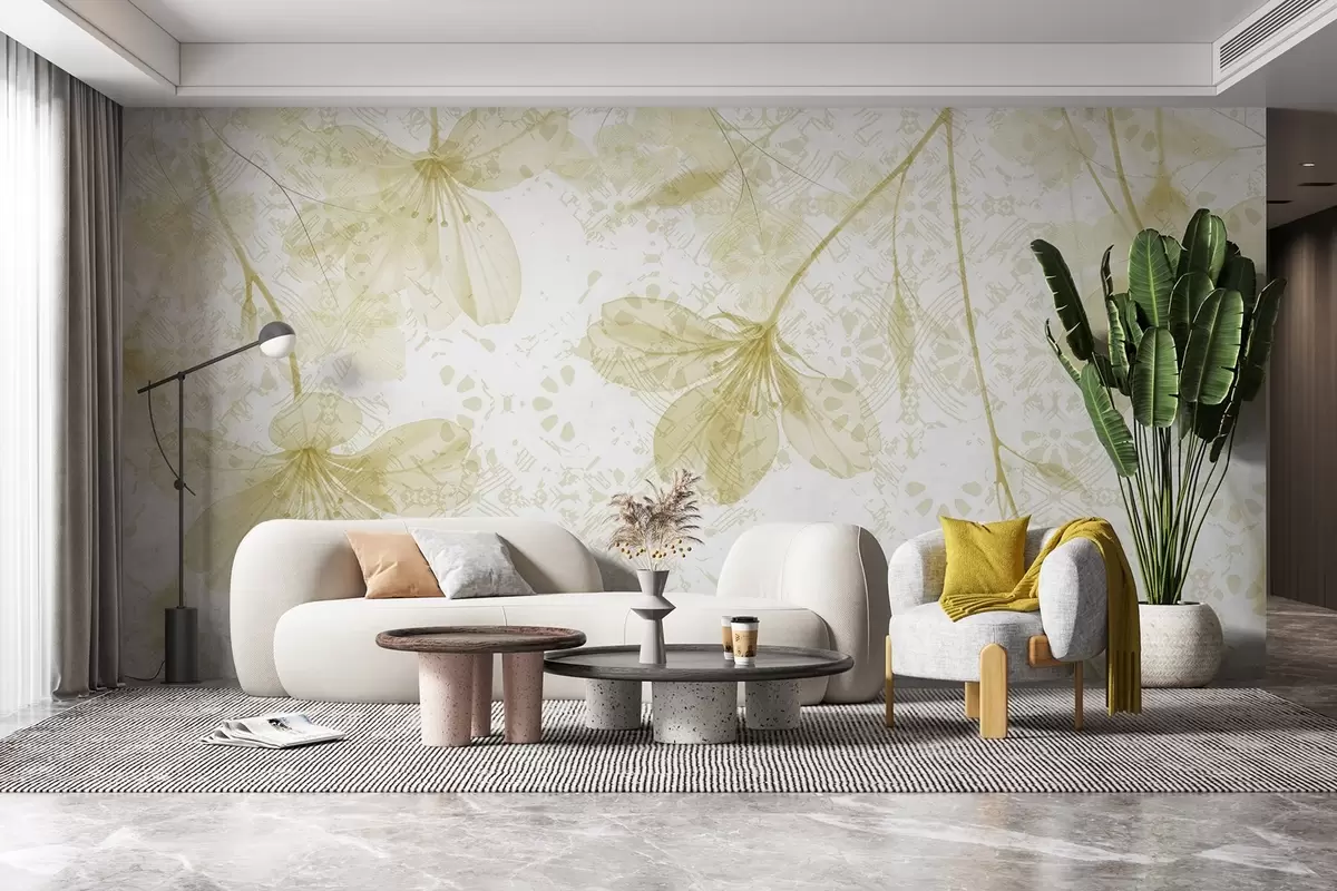 Fototapeten Zarte gelbe und weiße Blüten mit langen Stielen und Blütenblättern vor einem weichen, unscharfen, strukturierten Hintergrund N° w08588v2