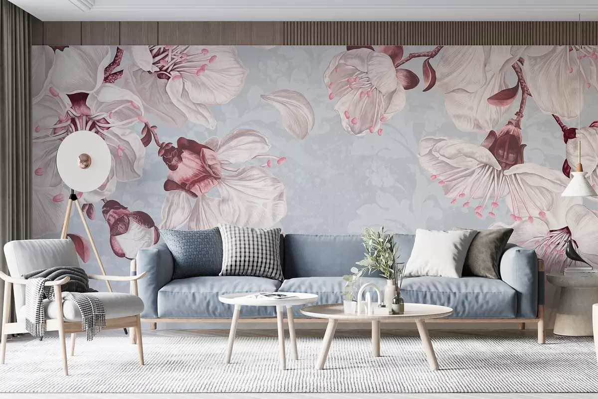 Fototapeten Ein Blumendruck mit großen rosa und weißen Kirschblüten vor einem hellblauen, strukturierten Hintergrund N° w08601