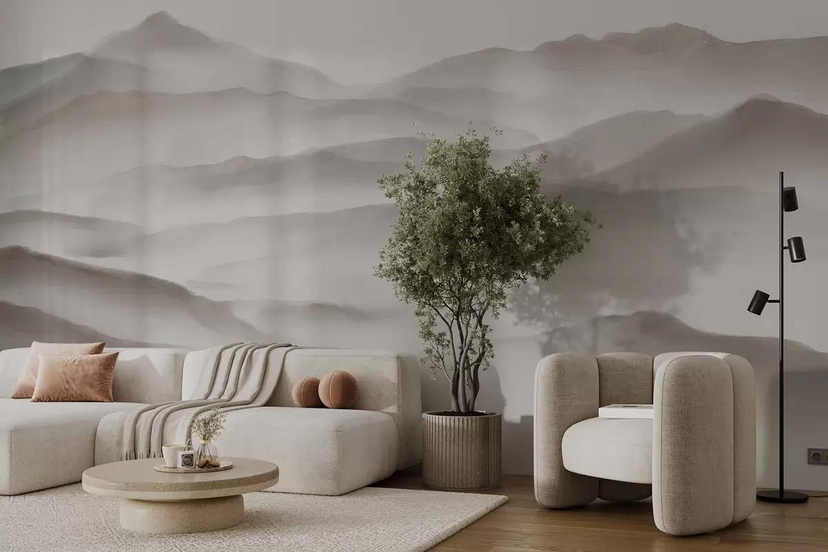 Fototapeten Minimalistische Gebirgslandschaft mit sanften Hügeln und Nebel, die einen ruhigen und stimmungsvollen Druck erzeugen N° w08602