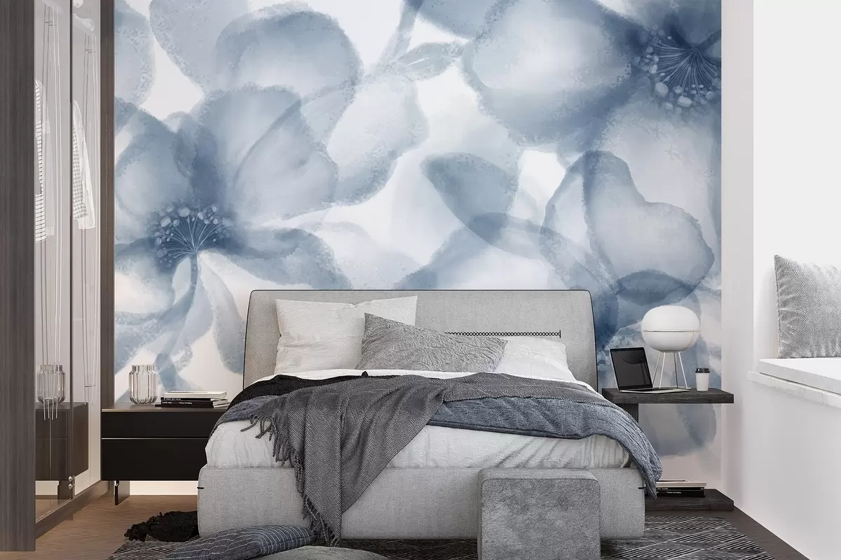 Fototapeten Weiche, verschwommene, abstrakte blaue Blumen, die einen heiteren und beruhigenden Blumendruck ergeben N° w08607