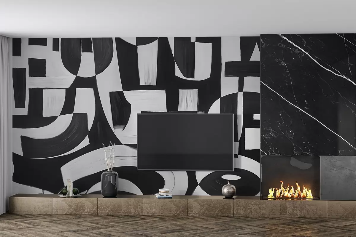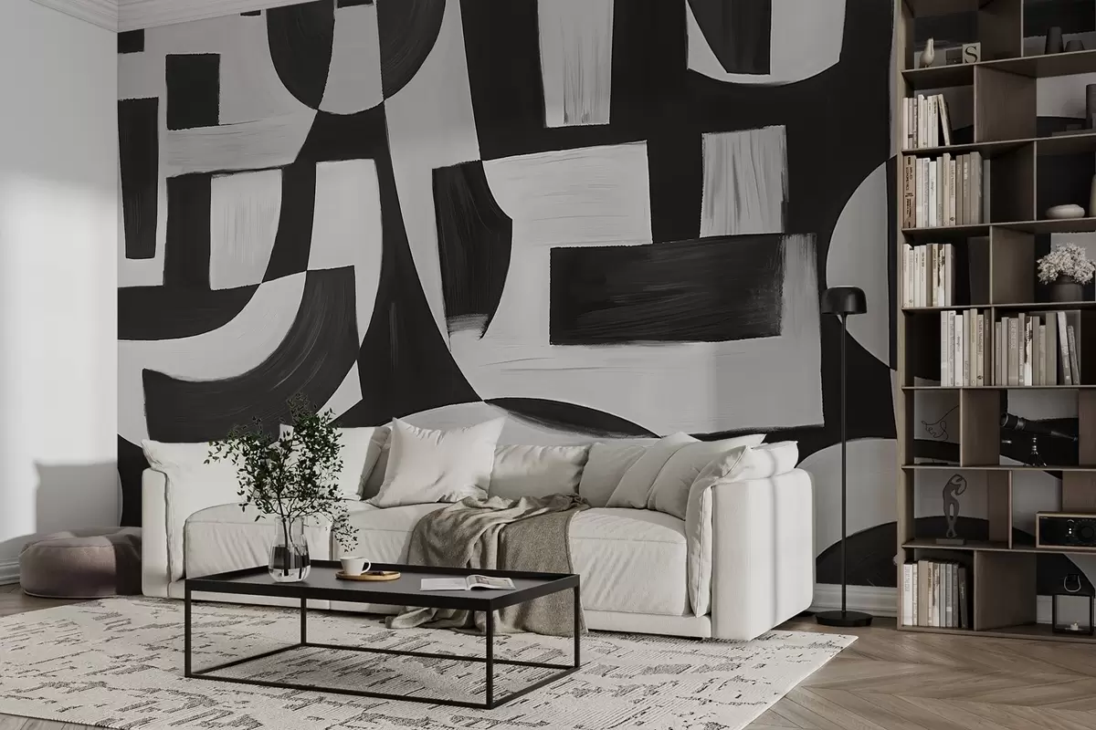 Fototapeten Abstrakte schwarze und weiße geometrische Formen und Muster, die eine visuell auffällige und dynamische Komposition ergeben N° w08608