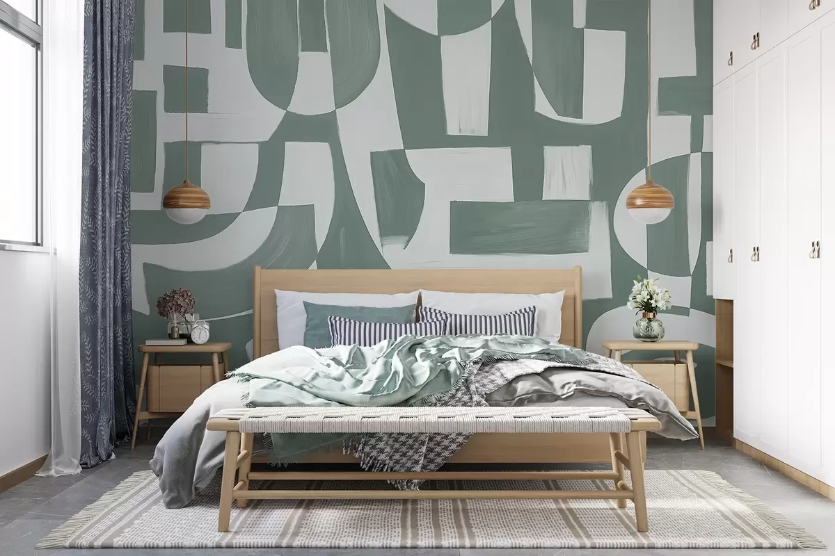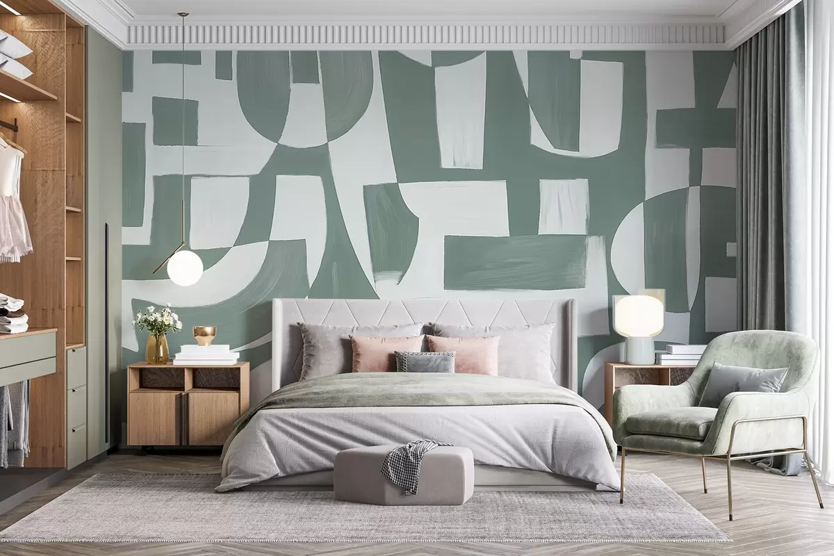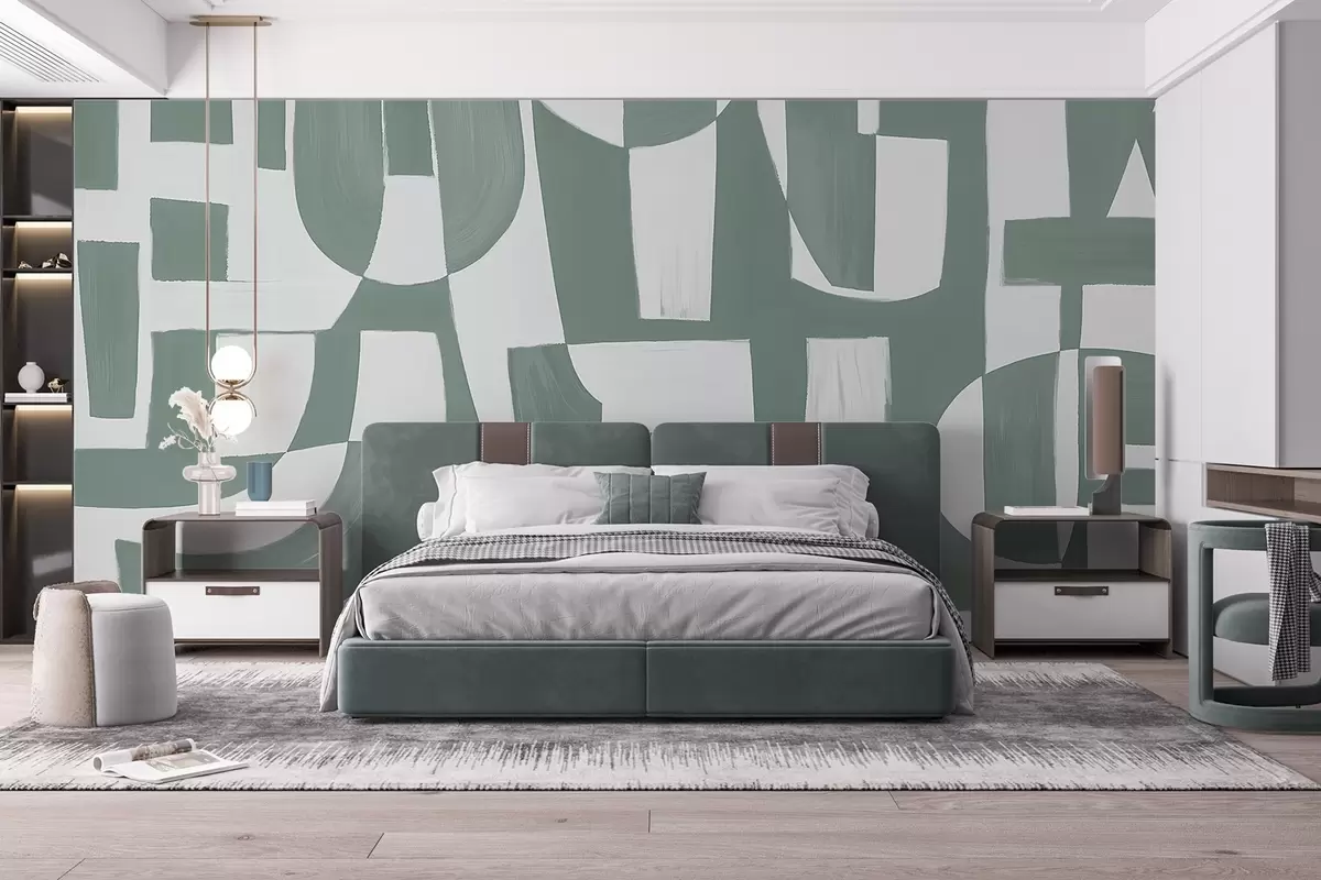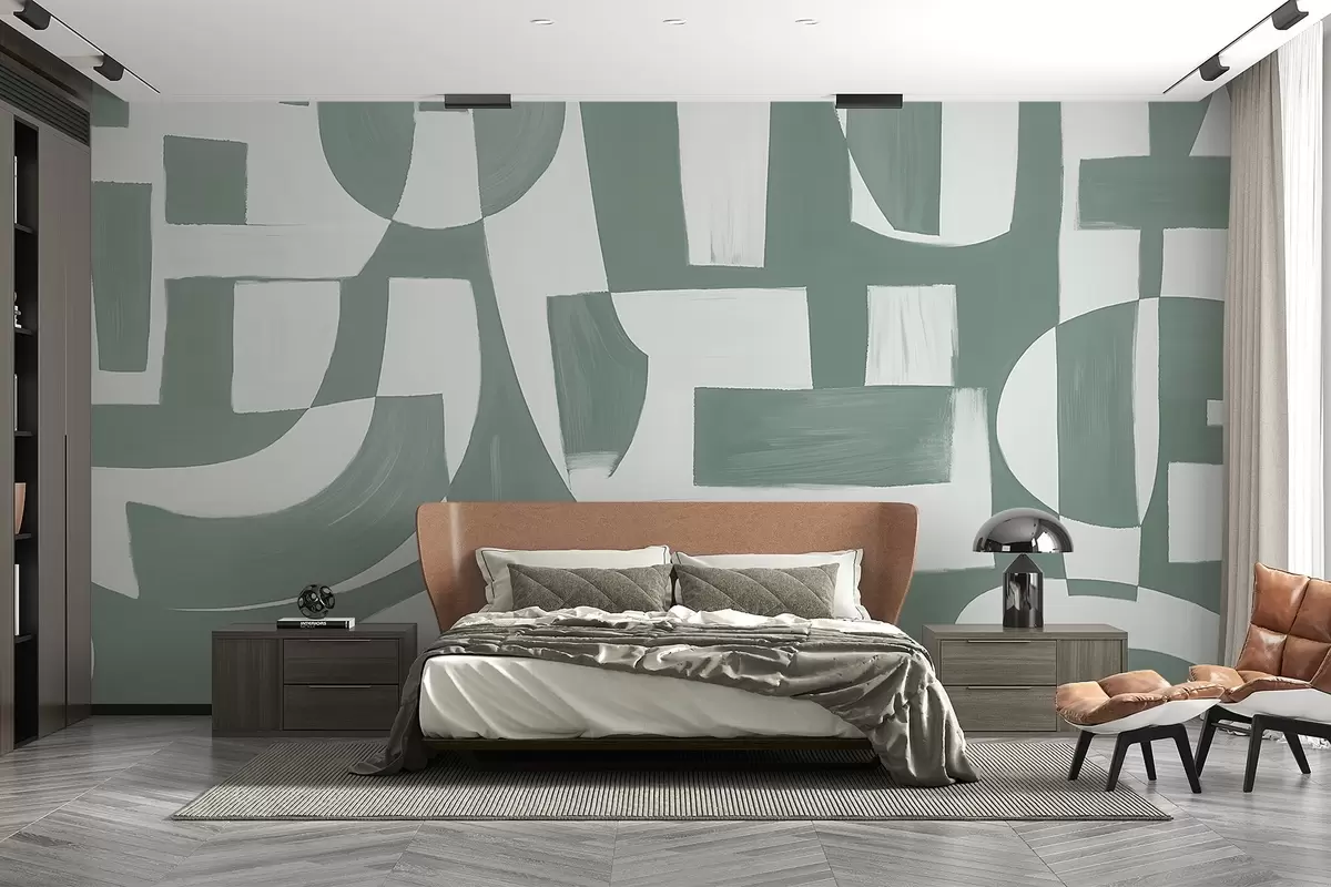 Fototapeten Abstrakte grüne und weiße geometrische Formen und Muster, die eine visuell auffällige und dynamische Komposition ergeben N° w08608v1