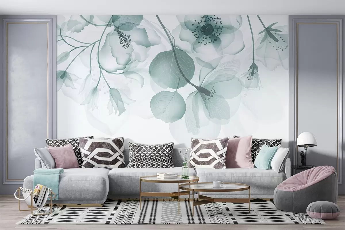 Fototapeten Zarte, gedämpfte, türkisfarbene, durchscheinende Blumen mit weichen Blütenblättern und dunkler Mitte vor hellem Hintergrund N° w08613v1