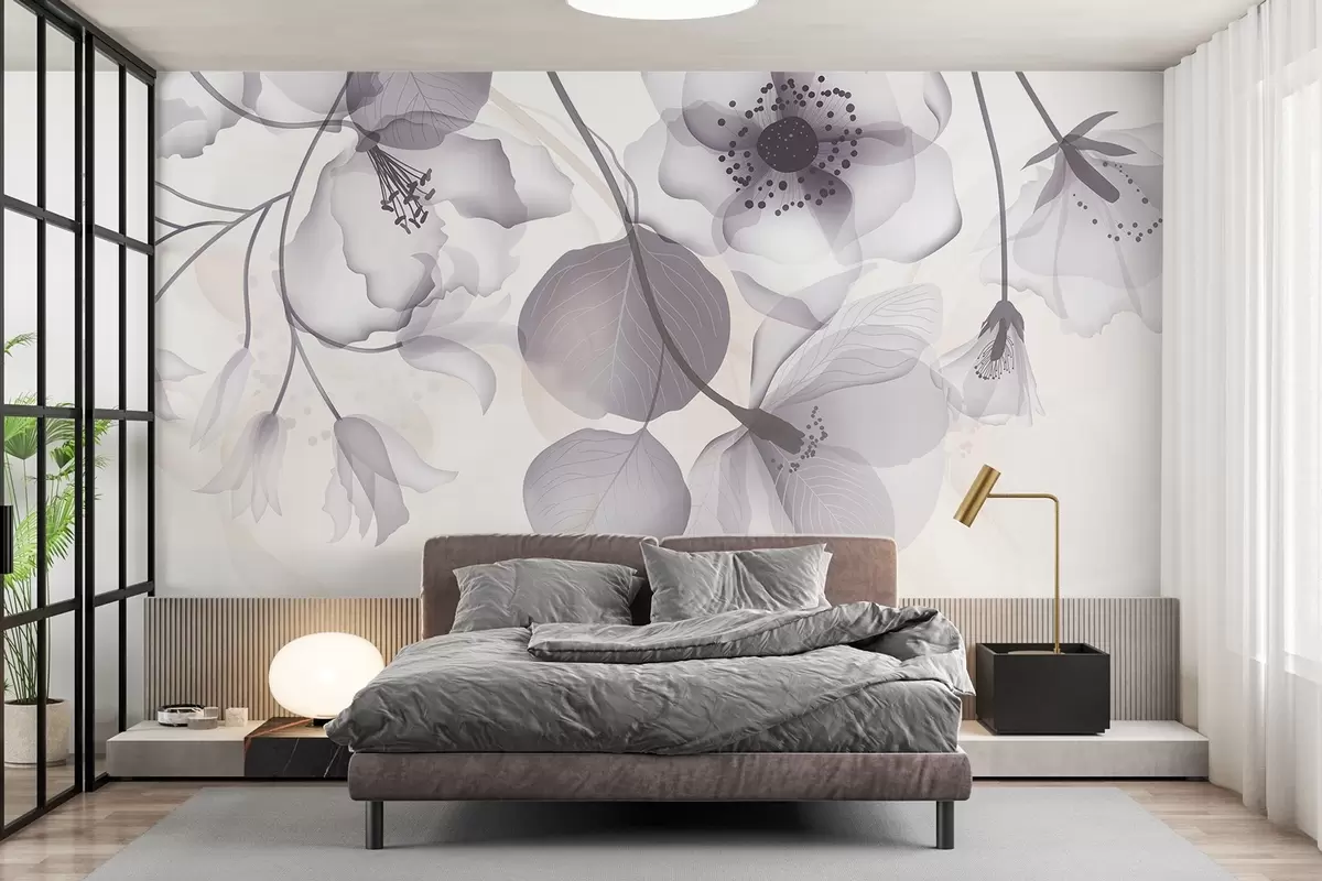 Fototapeten Zarte graue und beigefarbene durchscheinende Blumen mit weichen Blütenblättern und dunklen Zentren vor hellem Hintergrund N° w08613v2