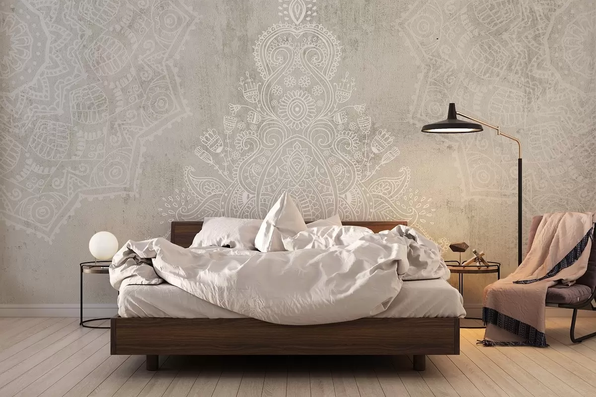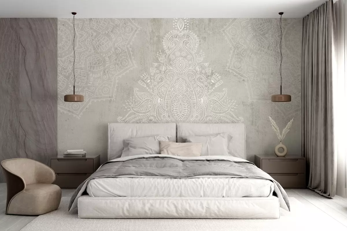 Fototapeten Ein detaillierter, verschlungener Mandala-Druck aus weißer Spitze auf einem hellbeigen, strukturierten, abstrakten Hintergrund N° w08614