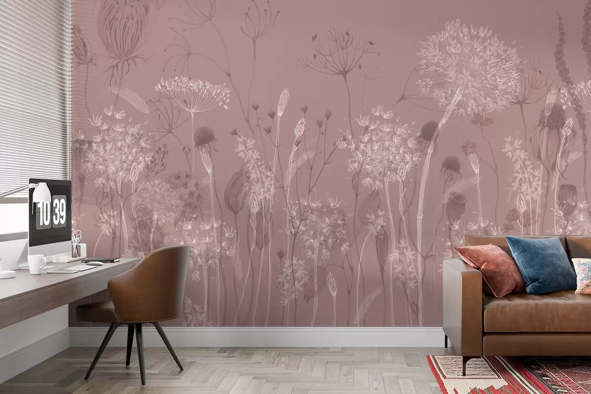 Fototapeten Luftige Pusteblumen und Wildblumen im Aquarellstil in Rosatönen N° w08637v1