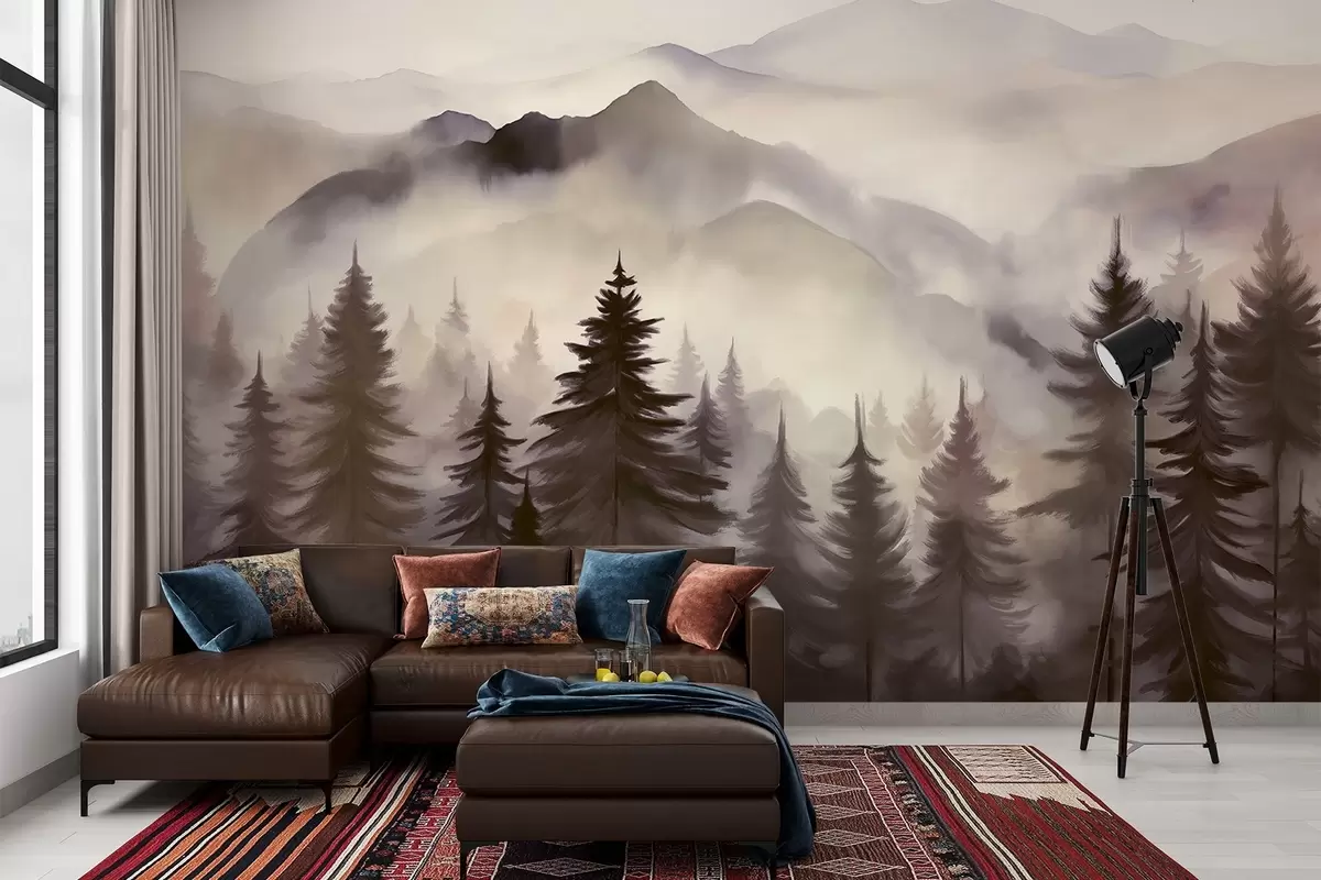 Fototapeten Berglandschaft mit einem Wald von Kiefern und geschichteten Berge während der Morgendämmerung mit leichten Nebel Aquarell Nachahmung Kunst N° w08639v1