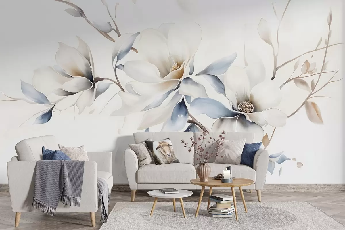 Fototapeten Zarte weiße Magnolienblüten mit weichen blauen Blütenblättern vor einem hellen Hintergrund Aquarell Nachahmung Minimalismus N° w08644