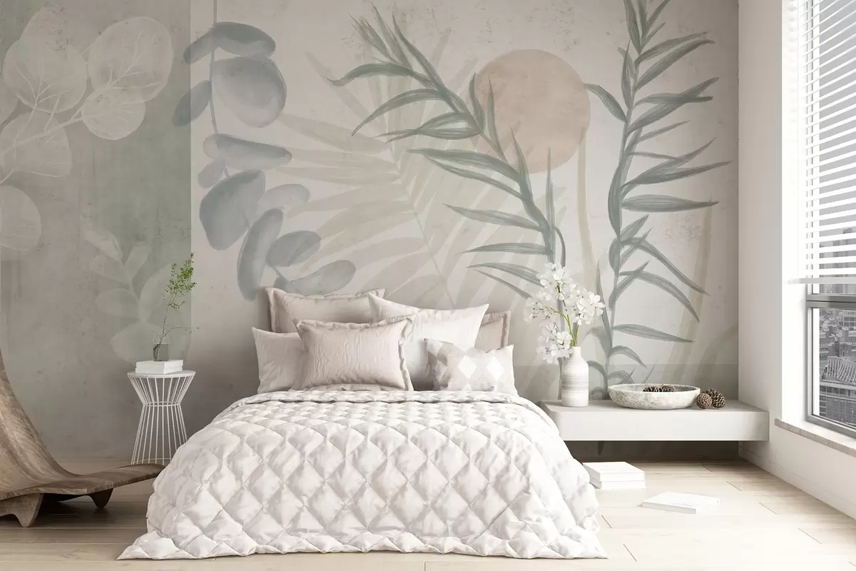 Fototapeten Ein minimalistischer abstrakter Druck mit stilisierten Blättern und Eukaliptus mit weichen, blauen organischen Formen in gedeckten Pastellfarben N° w08648v1