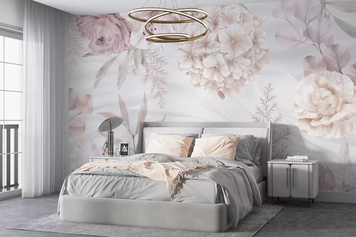 Fototapeten Ein weicher, abstrakter Blumendruck mit großen rosa und weißen Blüten, zarten Blättern und einer gedämpften, pastellfarbenen Farbpalette N° w08651