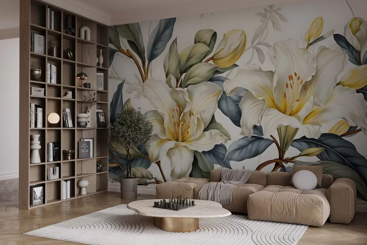 Fototapeten Gemälde von weißen Lilien mit gelben Akzenten und grünen und braunen Blättern, vor einem hellen Hintergrund N° w08661