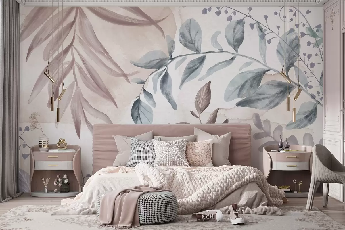 Fototapeten Botanischer Druck mit Blättern und Blumenzweigen in sanften Pastellfarben, auf aquarellartigem Hintergrund N° w08668