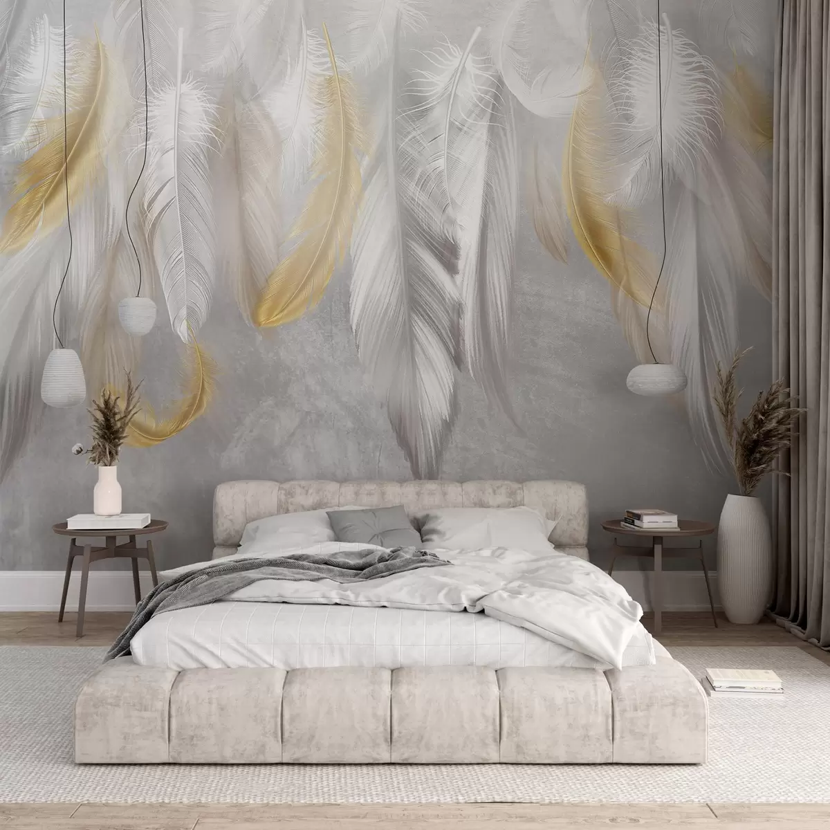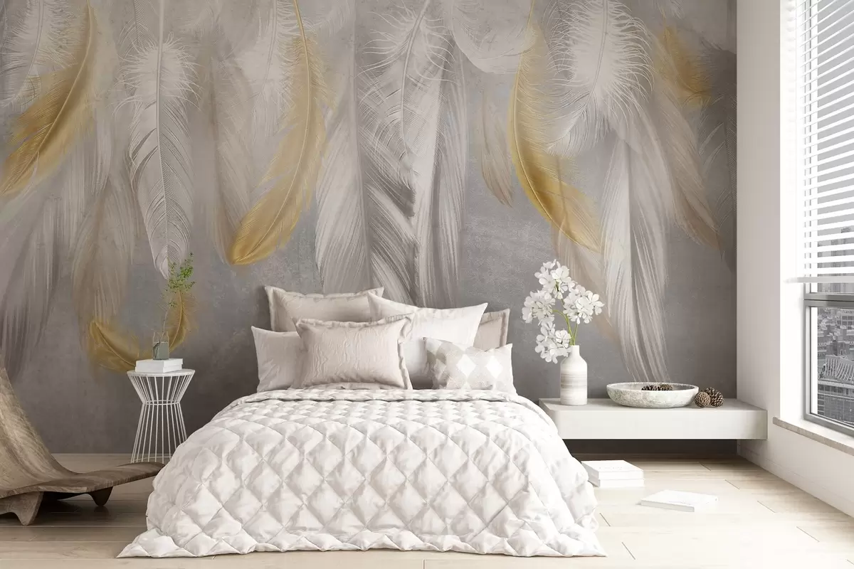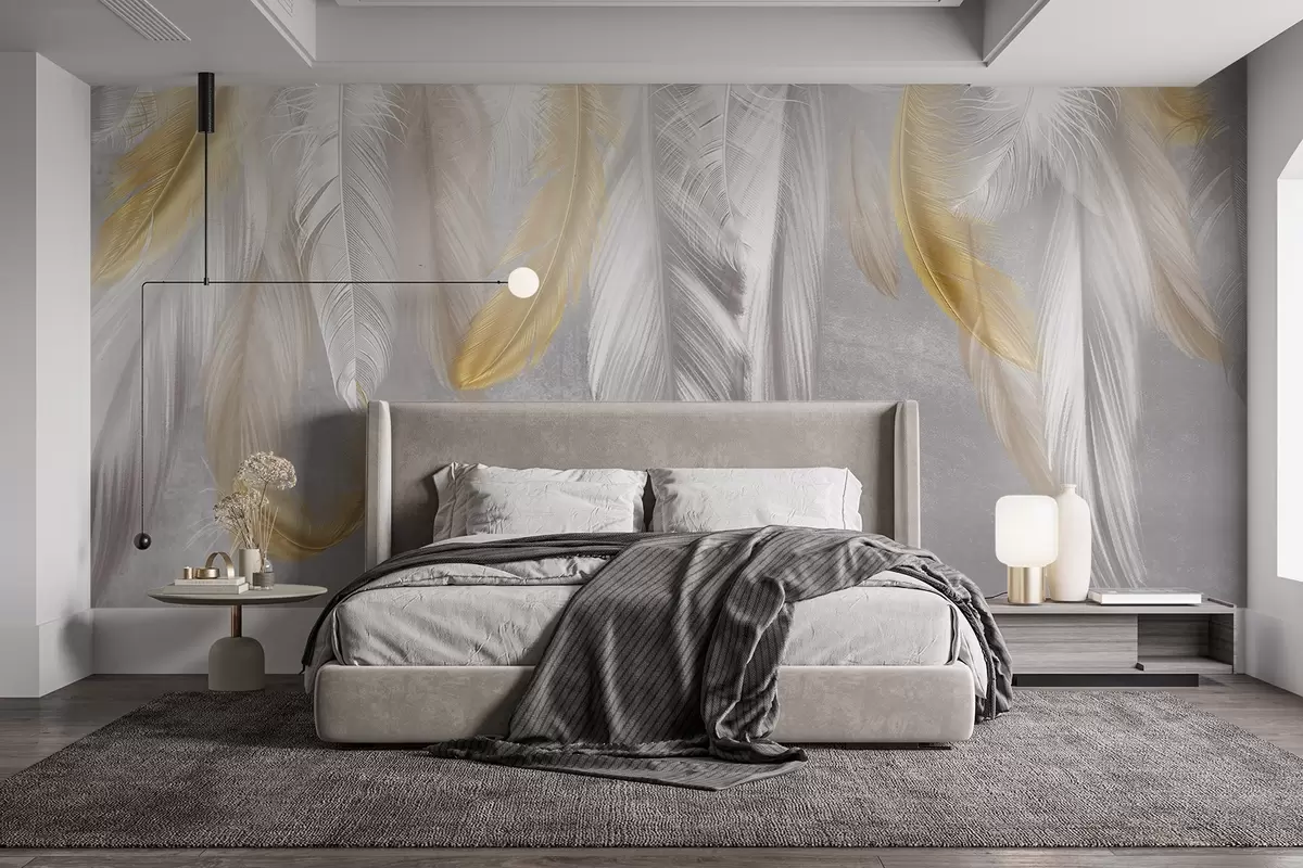 Fototapeten Weiße und gelbe Federn hängen vor einem weichen grauen Hintergrund und bilden eine zarte und luftige Komposition N° w08670