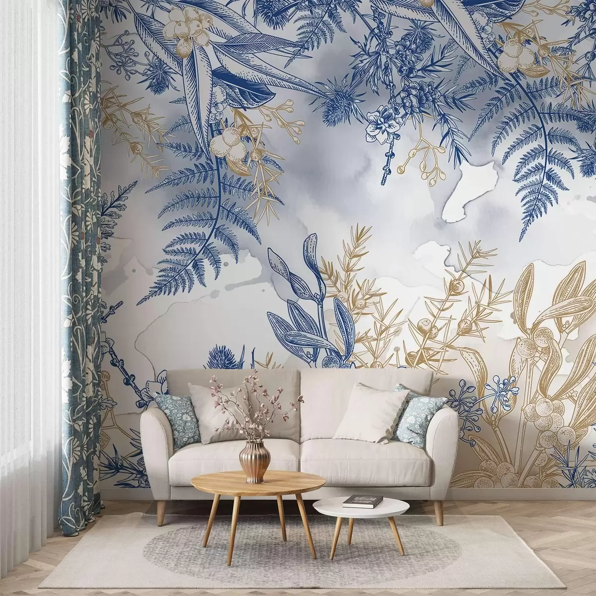 Fototapeten Ein Blumendruck mit blauen und gelben botanischen Elementen vor einem hellen, weichen Hintergrund mit Aquarelleffekten N° w08671