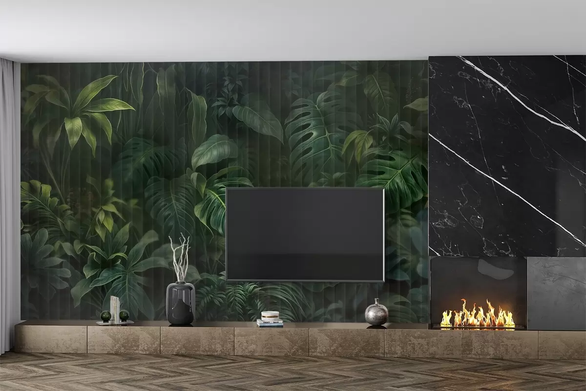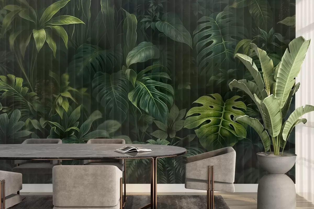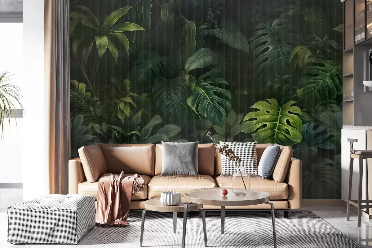 Fototapeten Tropischer dunkler, verschwommener und strukturierter Druck mit verschiedenen grünen Blättern, darunter Monstera und Palmenblätter N° w08673