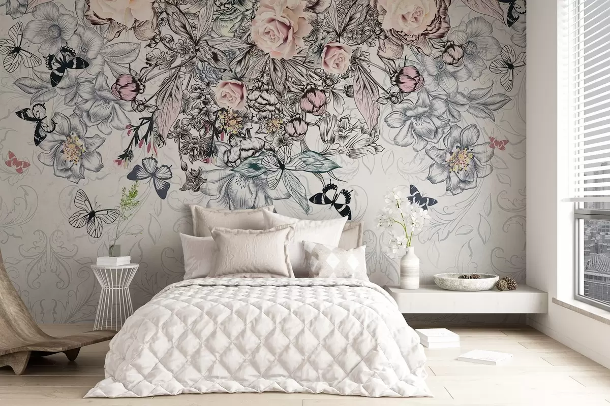 Fototapeten Eine florale Zeichnung mit rosa Rosen und verschiedene Blumen und Schmetterlinge mit komplizierten Linie Kunst auf strukturierten Hintergrund N° w08674