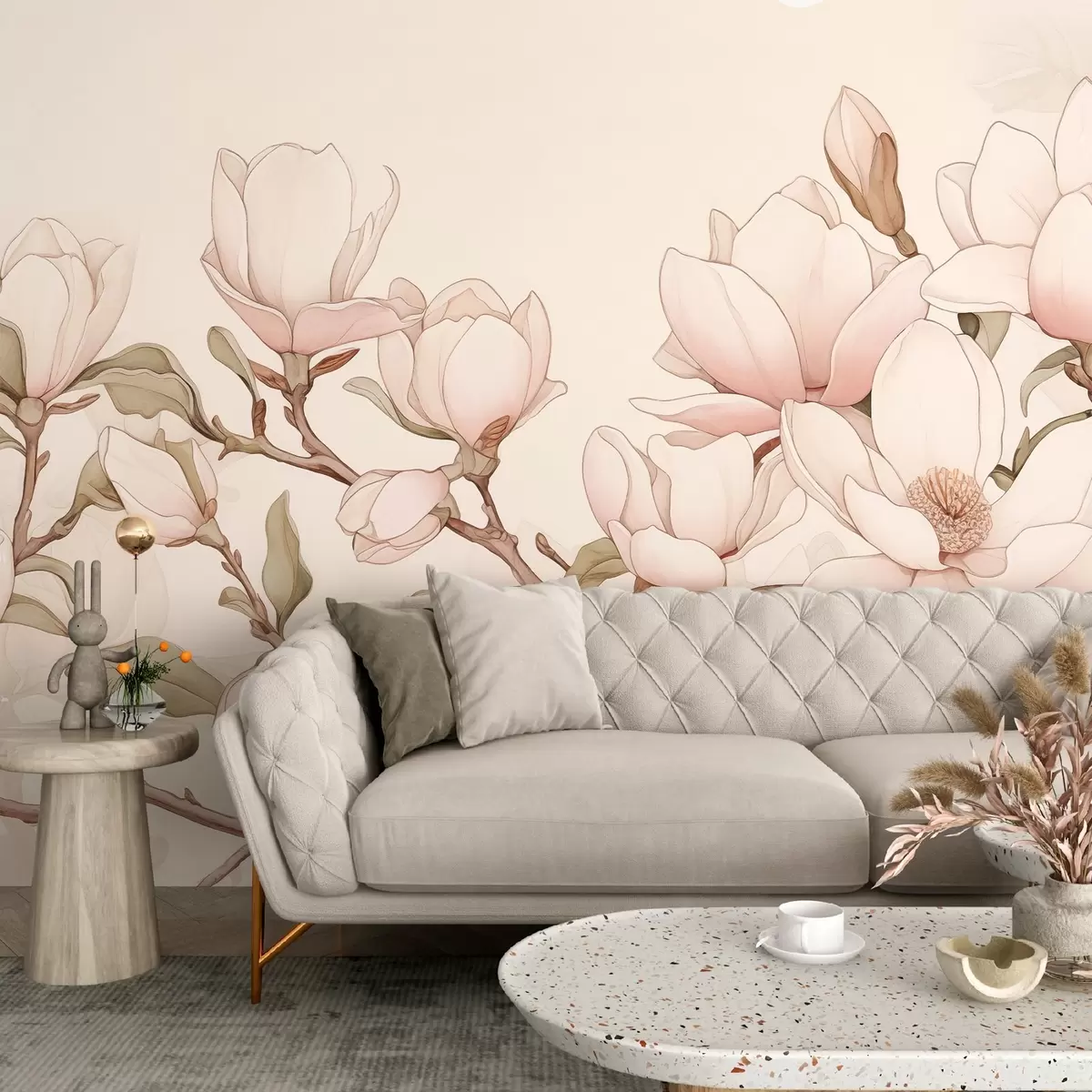 Fototapeten Magnolienzweige mit zartrosa Blüten auf hellem Hintergrund, die eine raffinierte und ruhige Atmosphäre schaffen N° w08688