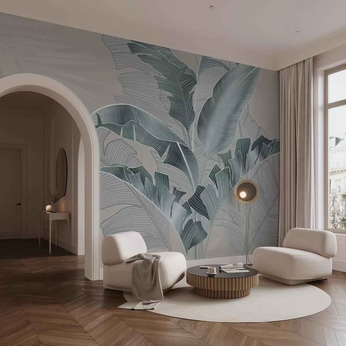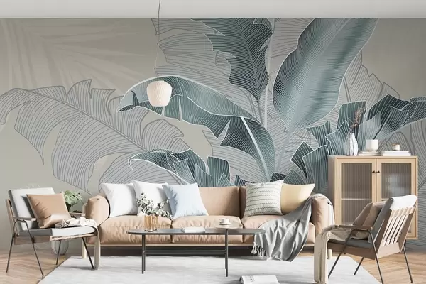 Fototapeten Eine harmonische Komposition aus tropischen Blättern in Beige- und Türkistönen mit detaillierter Linienführung N° w08698v1