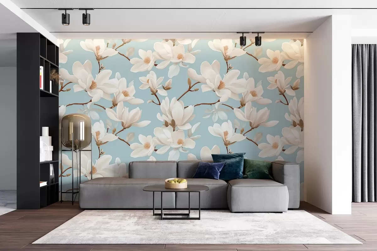 Fototapeten Muster aus weißen Magnolienblüten, pastellblauer Hintergrund, weiße Blätter und Zweige N° w08726