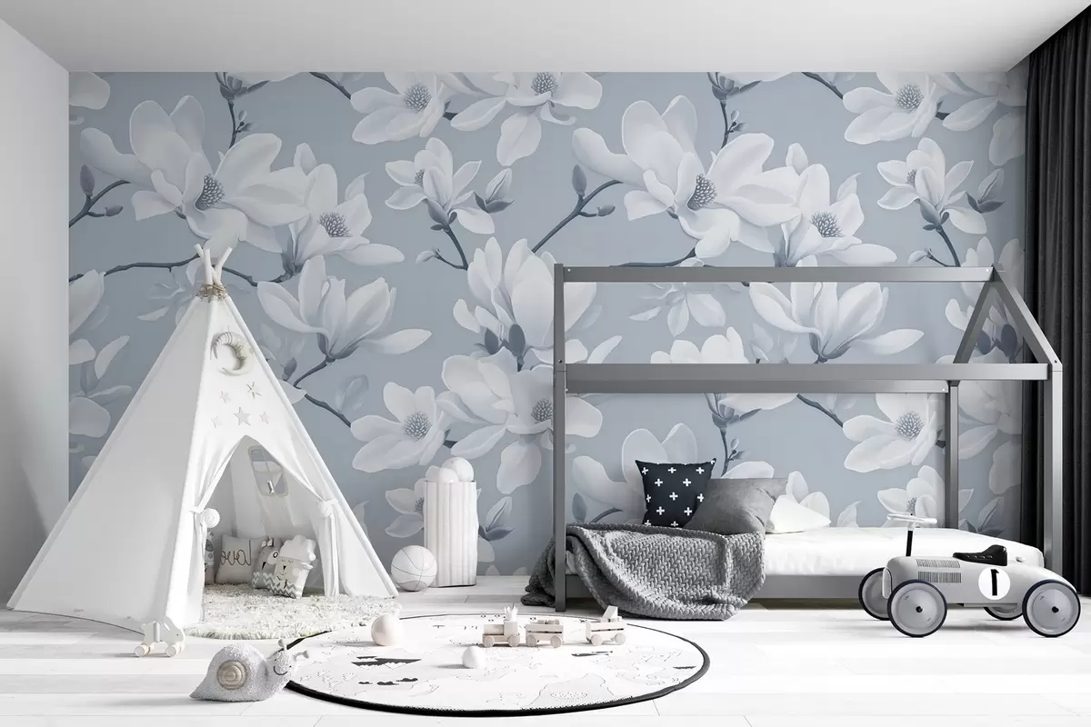 Fototapeten Muster aus weißen Magnolienblüten, in hellblauen Tönen, weißen Blättern und Zweigen N° w08726v2