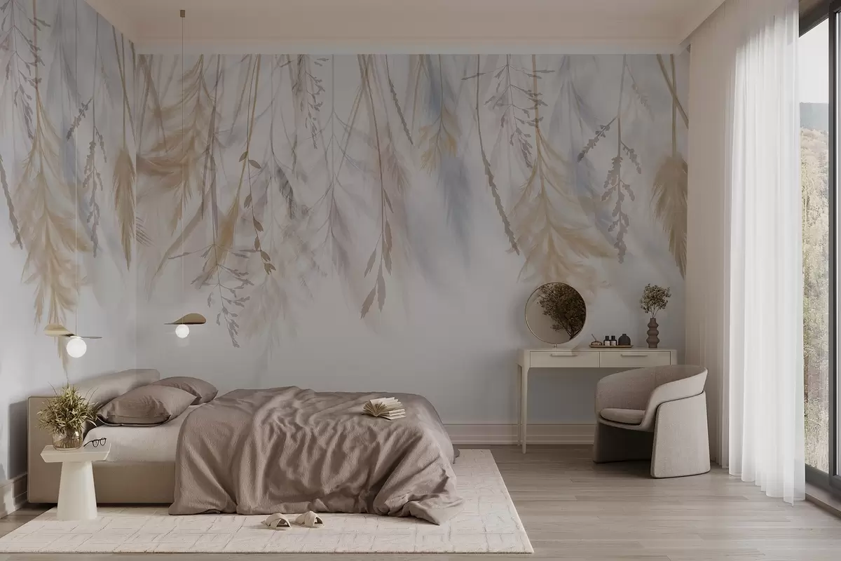 Fototapeten Zarte Gräser, Ährchen und Pflanzen in Pastelltönen, arrangiert in einem kaskadenartigen Druck vor einem hellen Hintergrund N° w08737