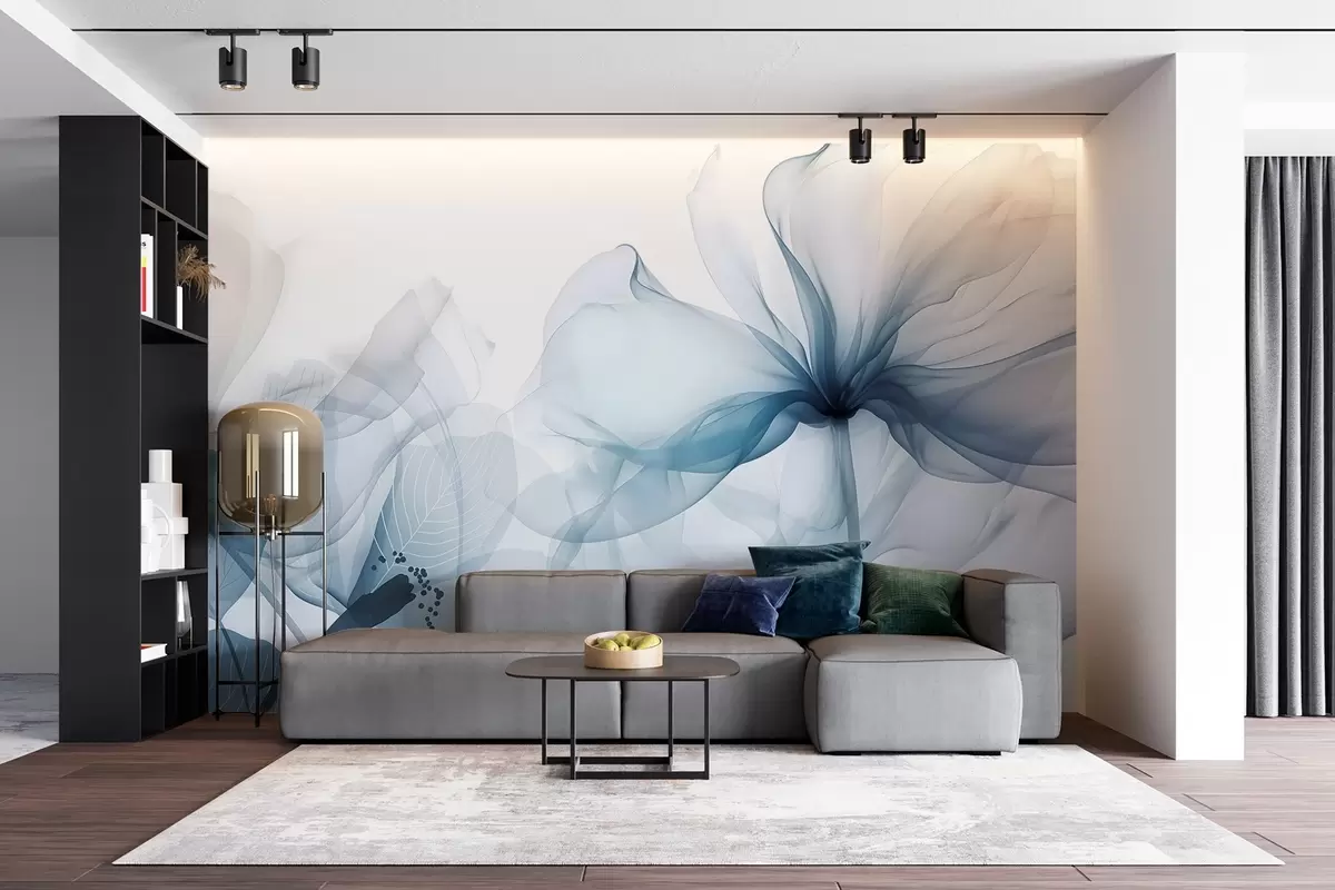 Fototapeten Blaue abstrakte Blumen mit weichen, durchscheinenden, fließenden Blütenblättern und zarten Details vor einem weißen Hintergrund N° w08742