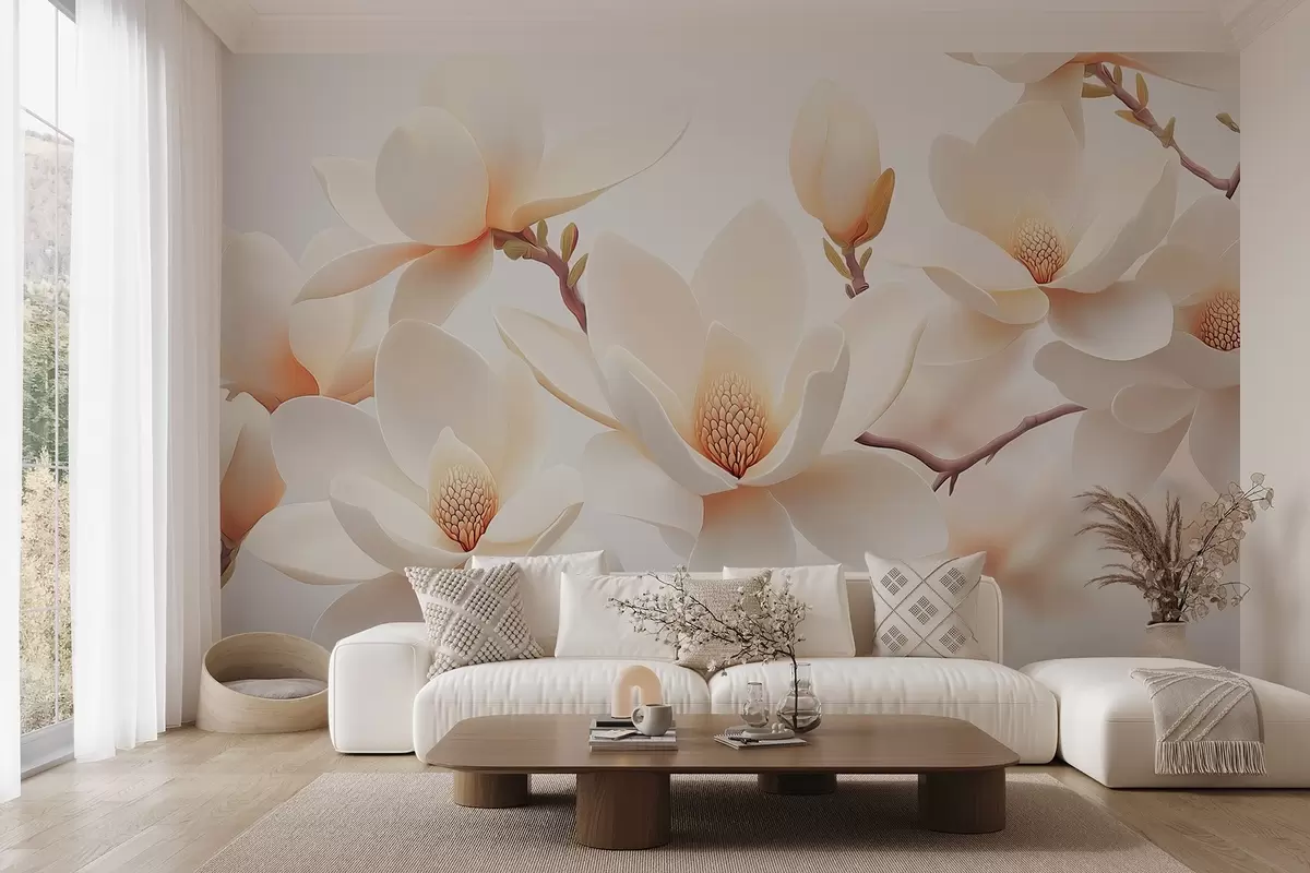 Fototapeten Blühende cremefarbene Magnolienblüten auf weißem Hintergrund N° w08745