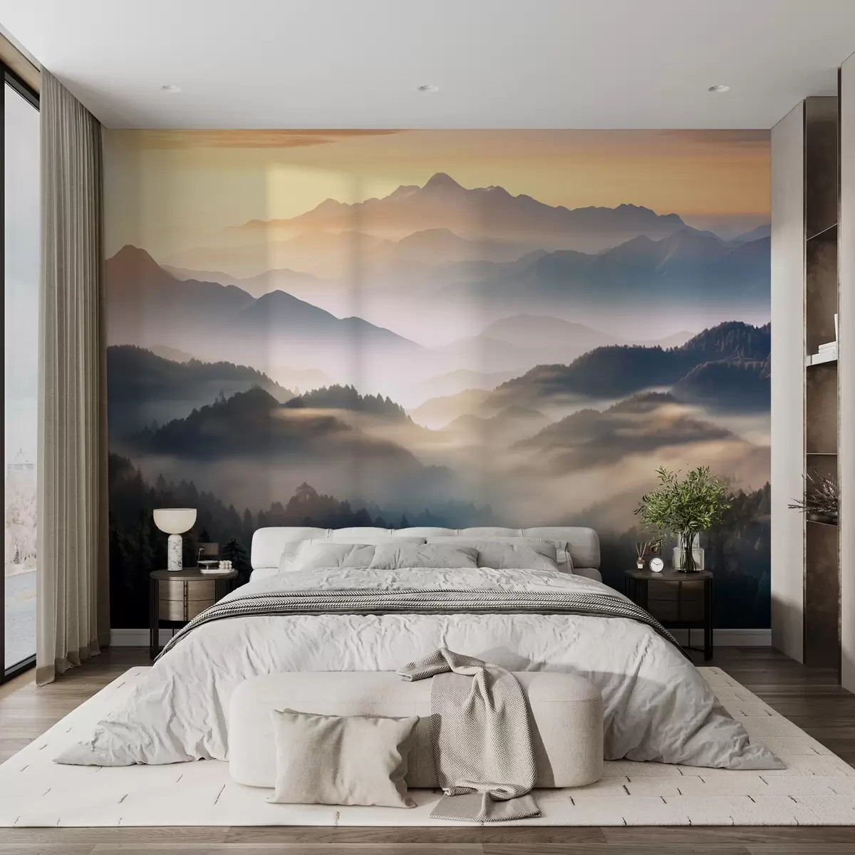 Fototapete Ruhige Berglandschaft in der Morgendämmerung, mit leichtem Nebel, der die Kiefern umhüllt w08748