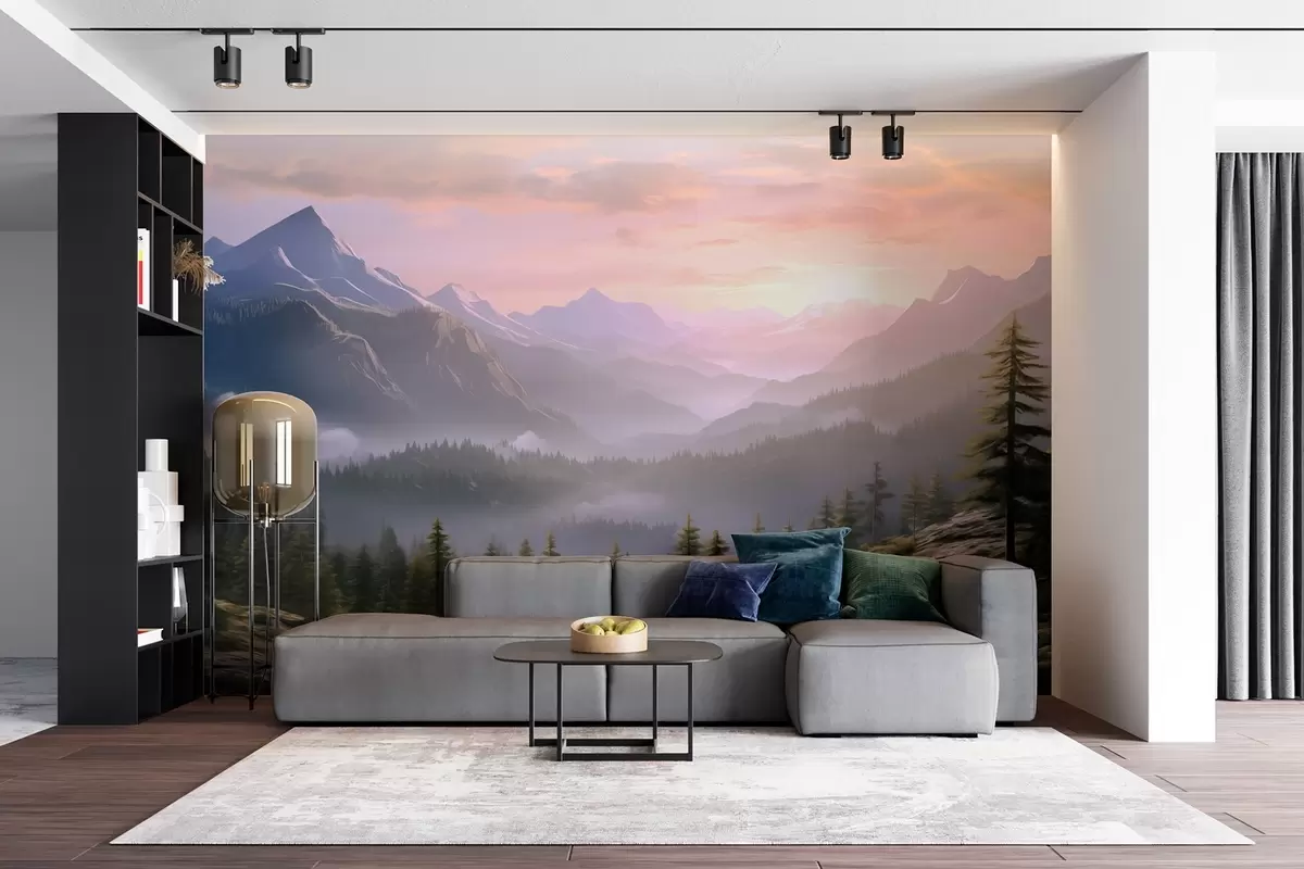 Fototapeten Ruhige Berglandschaft in der Morgendämmerung mit leichtem Nebel vor einem Waldhintergrund N° w08750