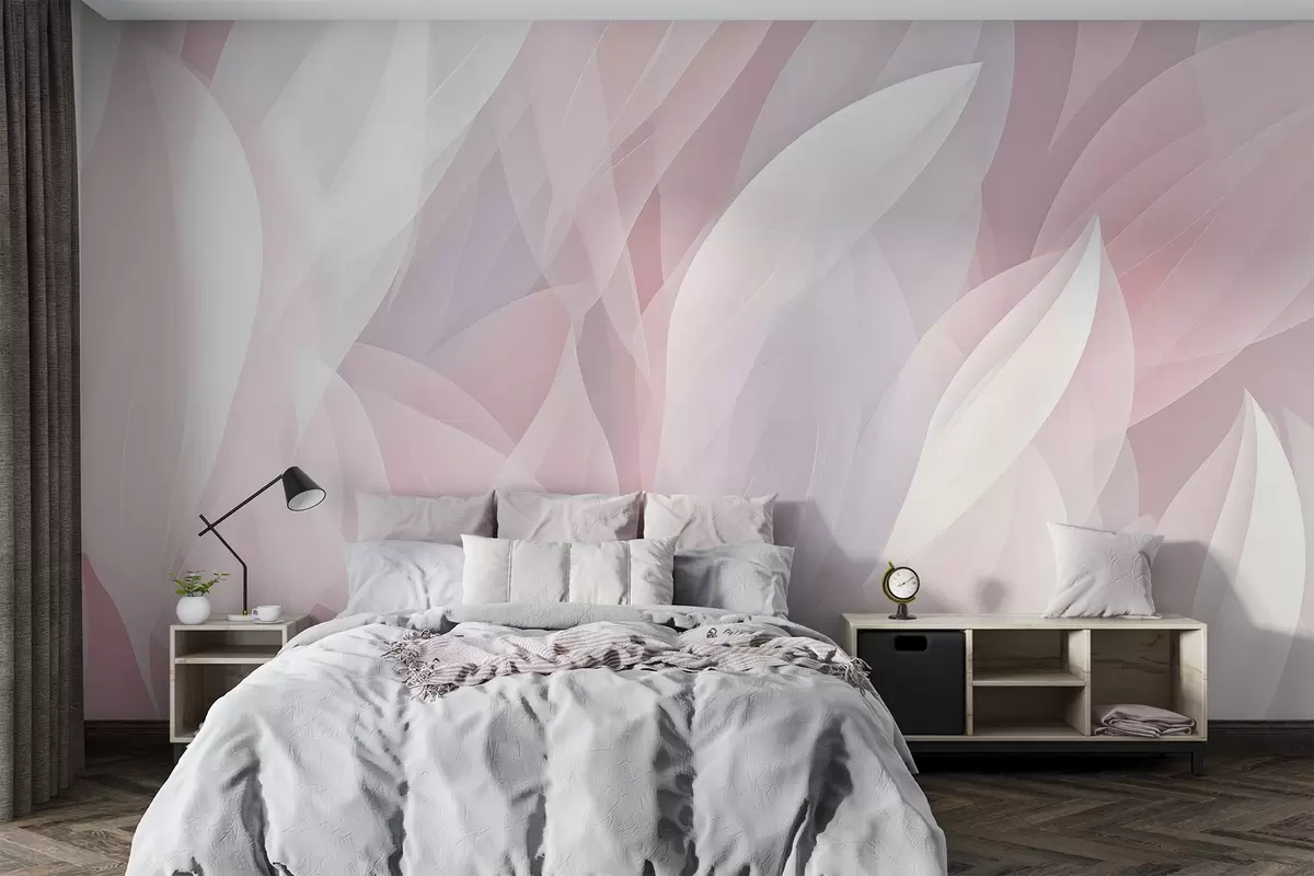 Fototapeten Abstraktes Design mit weichen, blütenblattähnlichen Formen in Rosa- und Weißtönen, die einen mehrschichtigen Effekt erzeugen N° w08774