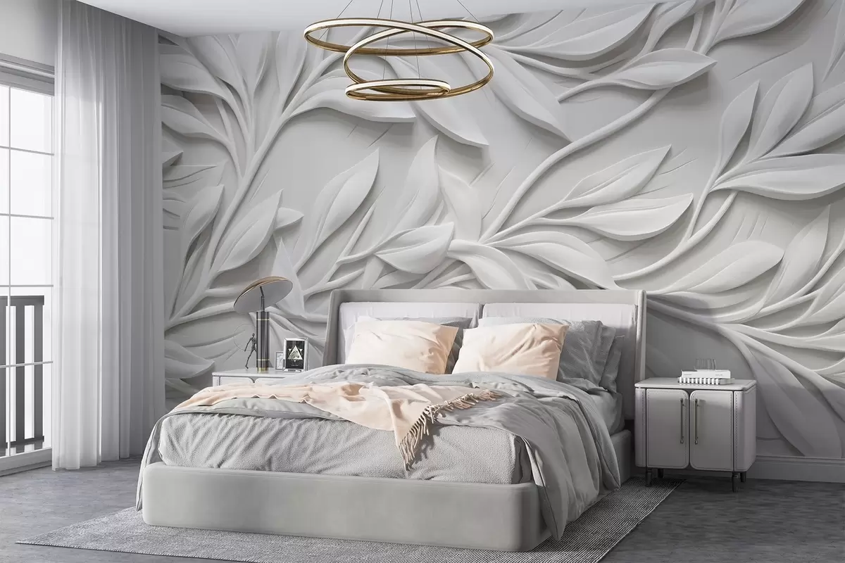 Fototapeten Weißer Strukturdruck mit Blättern und Zweigen, die einen voluminösen Imitationseffekt auf einem strukturierten Hintergrund erzeugen N° w08778