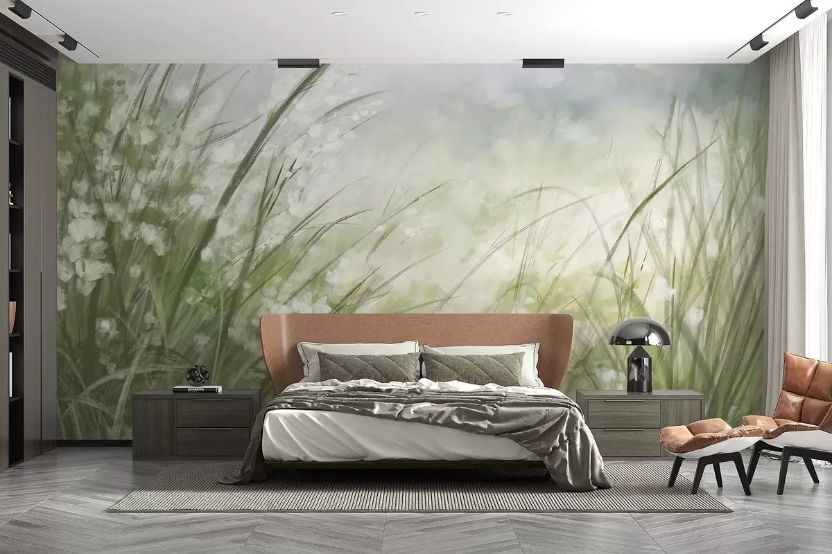 Fototapeten Üppig grünes Gras mit zarten weißen Blüten, sanft verschwommener Druck mit hellen Farbtönen, die eine ruhige Landschaft schaffen N° w08779
