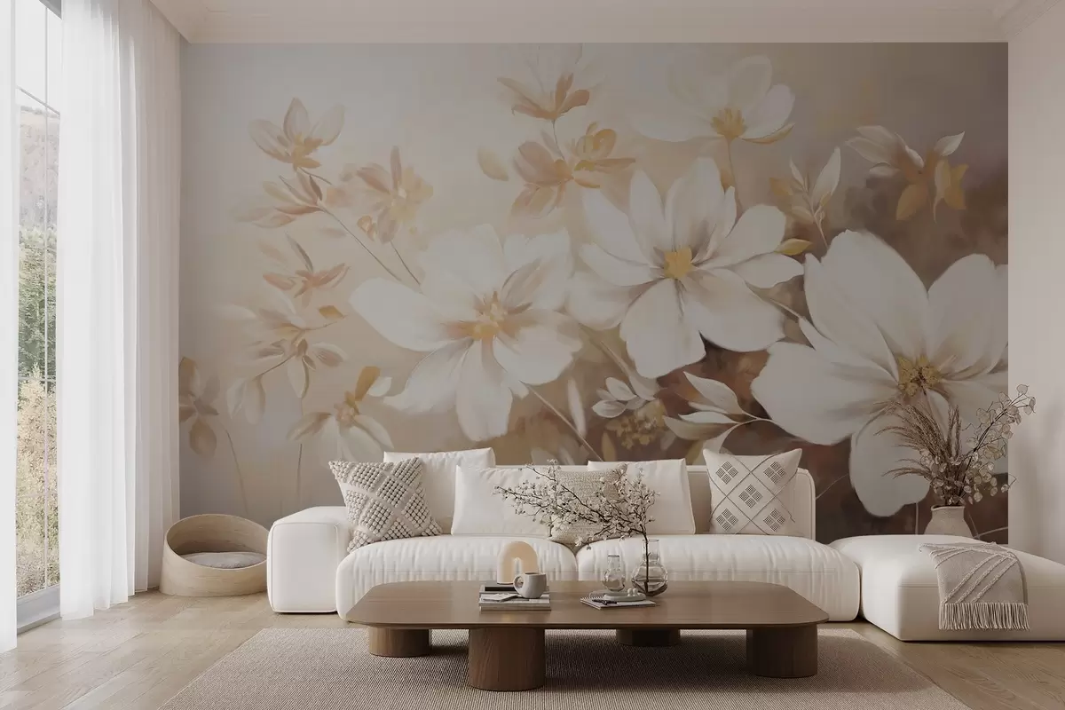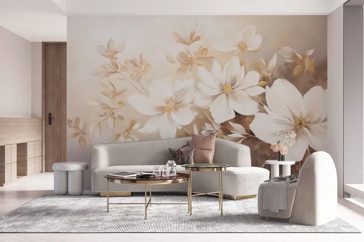 Fototapeten Weiß gemalte Blumen mit zarten Blütenblättern und zarten Blättern, vor einem hellbeigen und cremefarbenen Hintergrund N° w08780