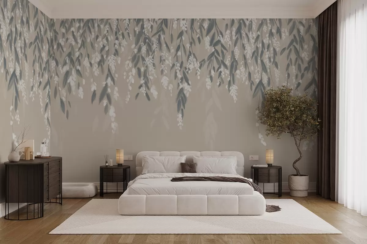 Fototapete Kaskadierende Laubzweige in gedämpften Grüntönen mit weißen Blüten und Blättern auf beigem Hintergrund w08781
