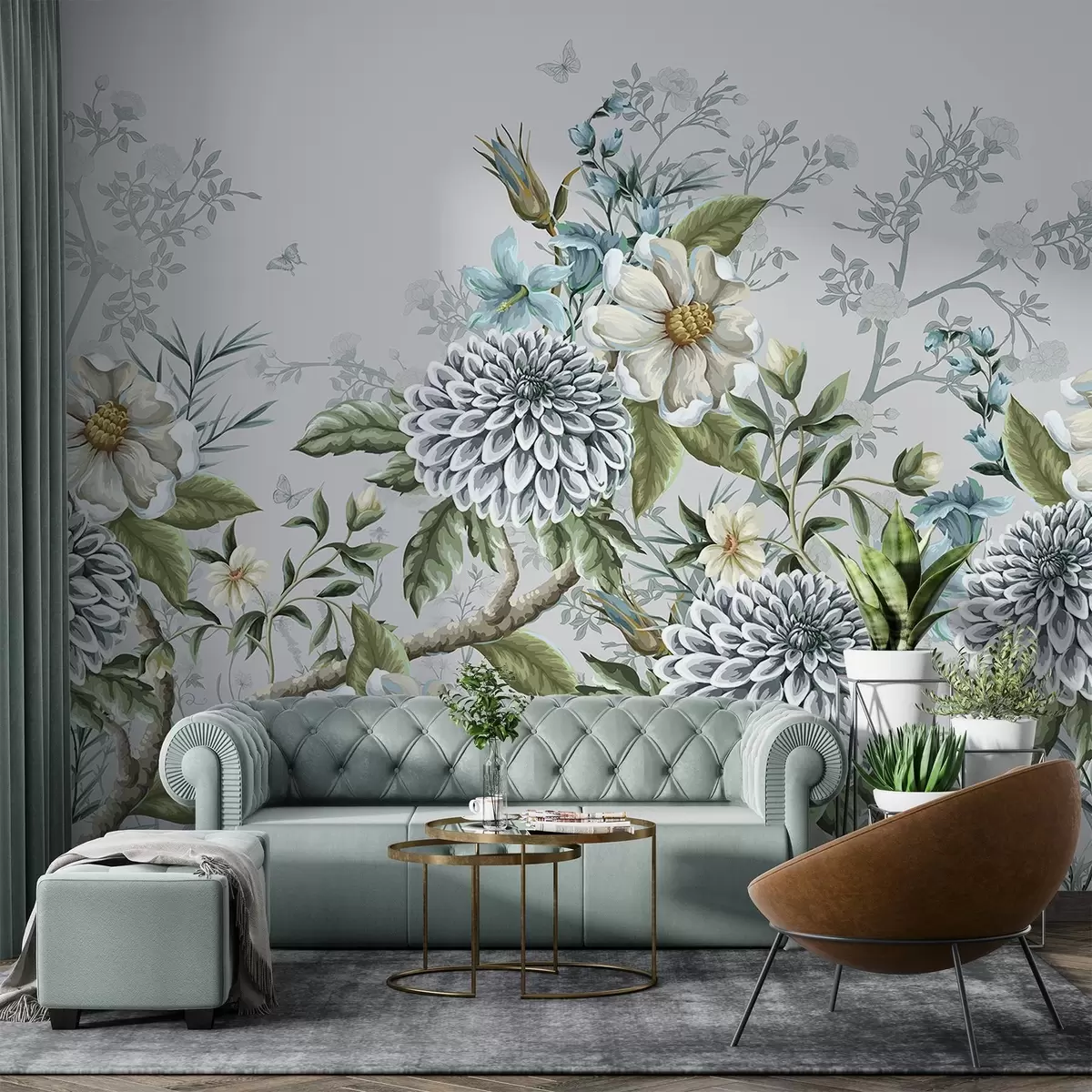 Fototapeten Ein Blumendruck mit Chrysanthemen, zarten blauen Blüten und grünen Blättern, die mit Zweigen verflochten sind N° w08782