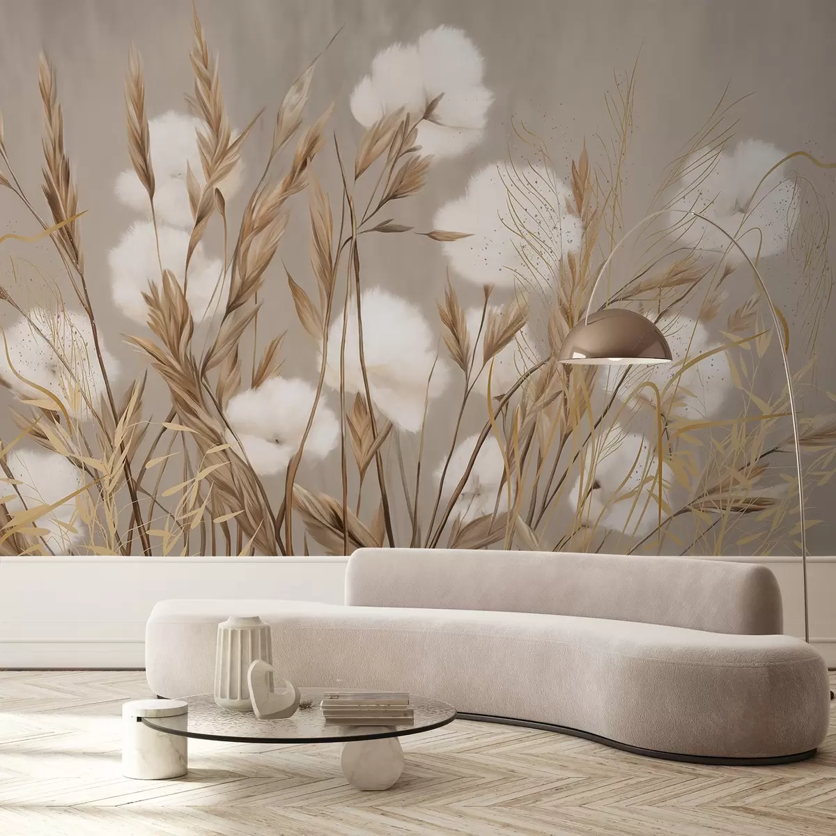 Fototapeten Weiche, flauschige weiße Baumwollblumen und hohe orangefarbene Gräser mit Ähren vor einem gedämpften, strukturierten beigen Hintergrund N° w08784